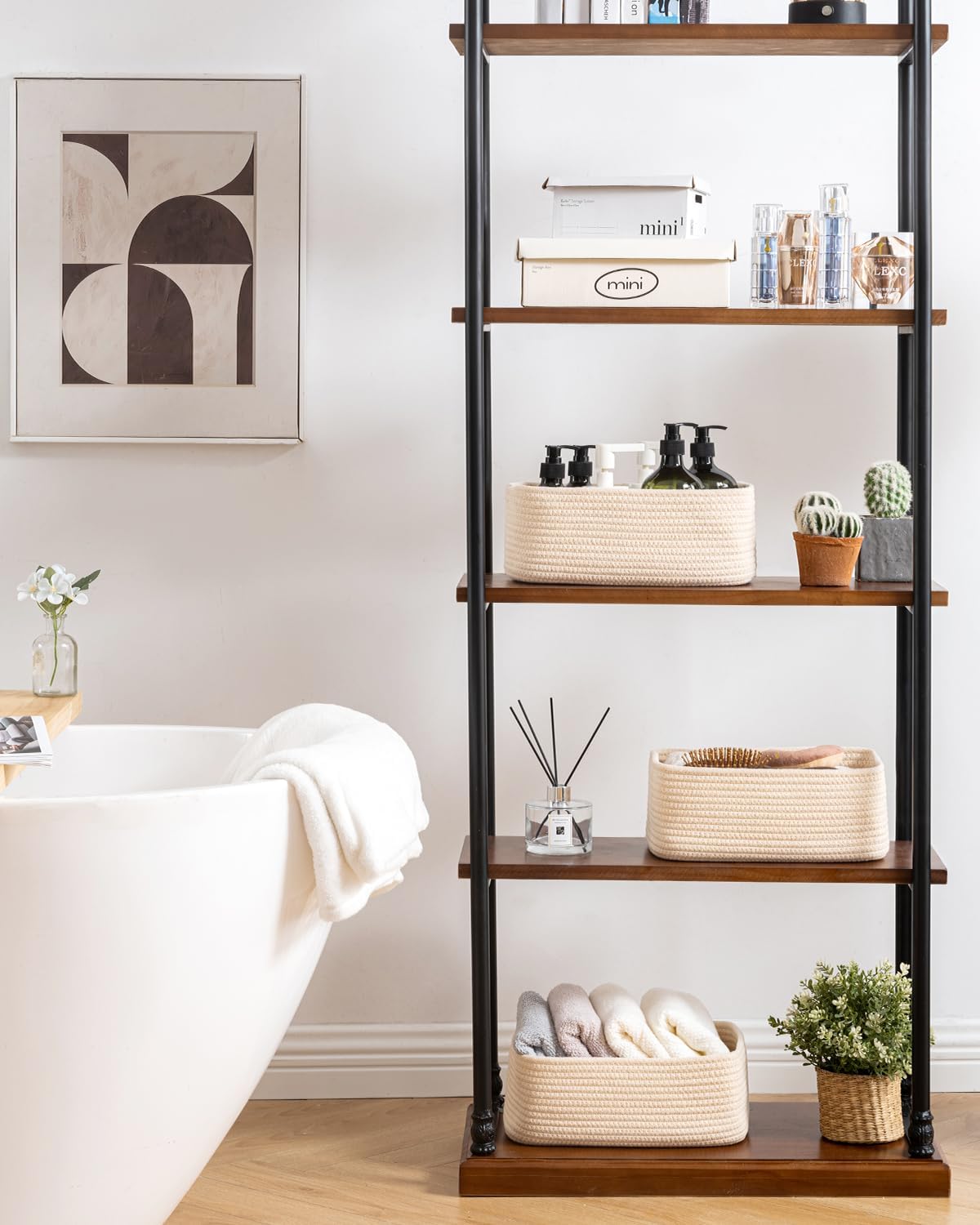 - [ Elegantly Designed to Match Any Décor ] Our small rope basket creates a minimalist appearance, and it adds a touch of warmth and texture to any room. The classic solid color design ensures seamless integration with your existing aesthetics, complementing any decoration. Perfect as decorative storage baskets for shelves, cabinets, and any open display space, making them a stylish and practical addition to any decor, enhancing the overall aesthetics of your room