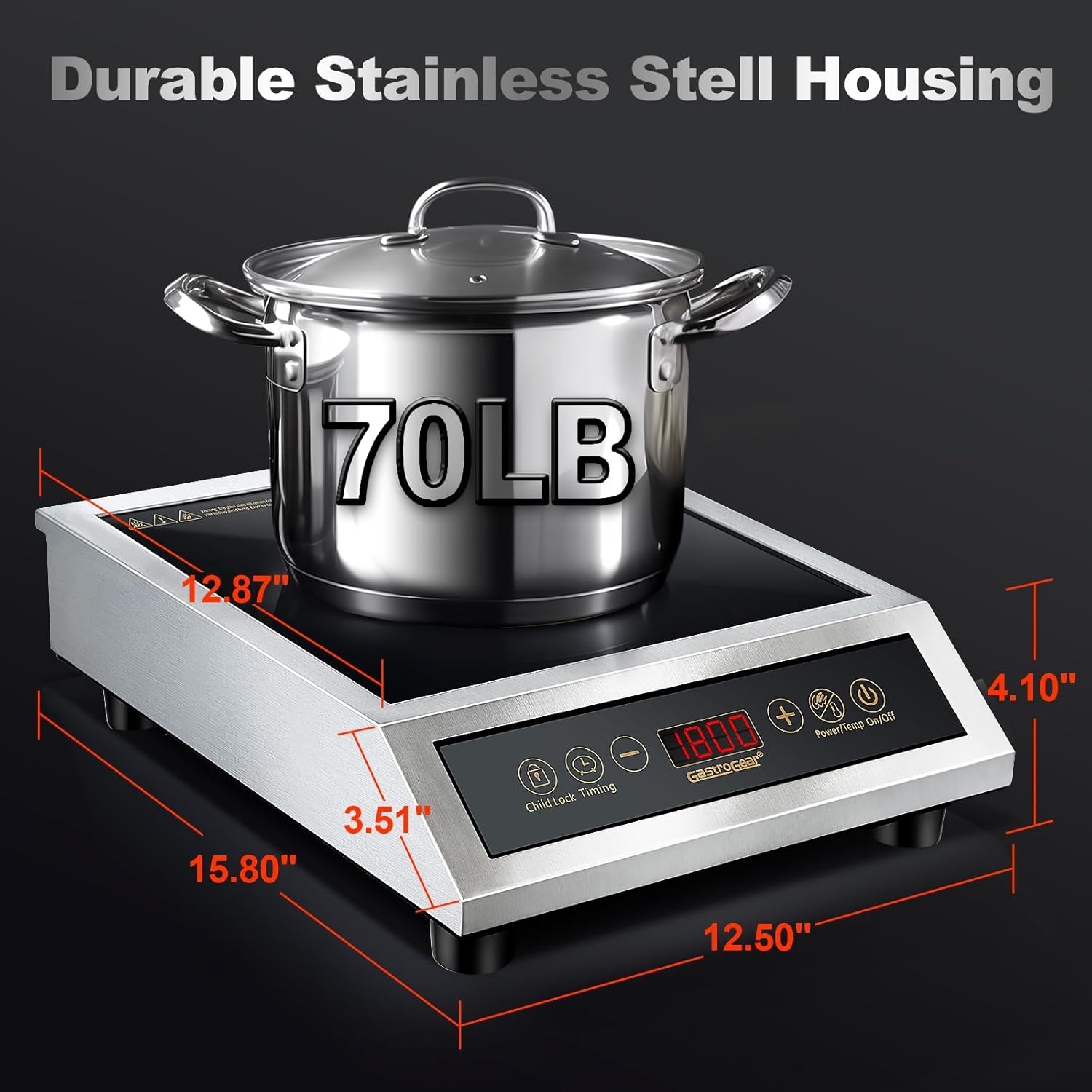 - Great Cooking Efficiency: Our 1800W commercial grade induction cooktop is designed for fast heating, with a temperature range from 176°F to 464°F to accommodate various cooking needs, from slow simmering to rapid boiling. Equipped with a standard 110V household plug for immediate use, it requires no additional adapters. This induction cooktop features a full-power stage for fast heating and a low-power stage to keep food warm