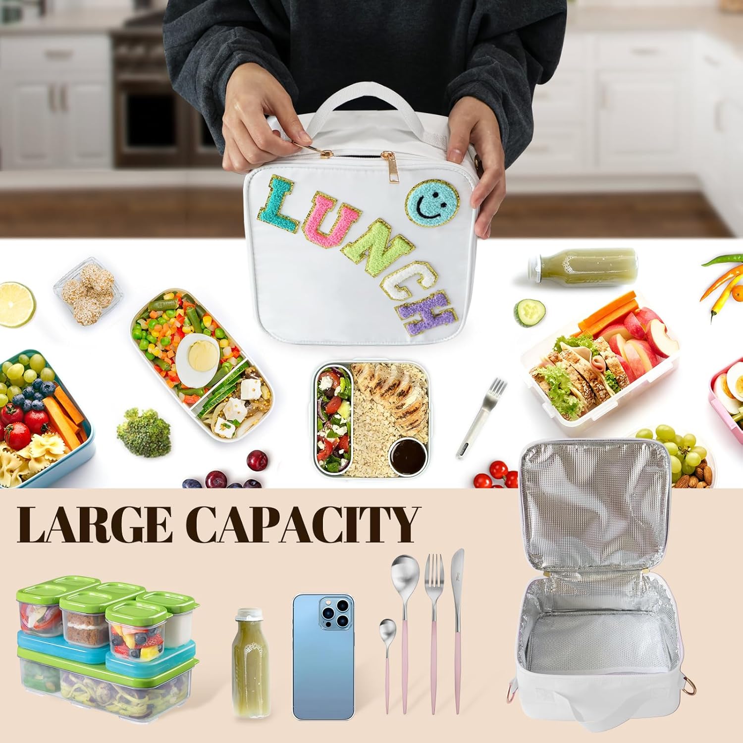 - UNIQUE DESIGN: Cute smiley face design, give you a good mood every day. The reusable lunch box has a handle and features a detachable and adjustable shoulder strap. There are three ways to carry it as a shoulder bag, crossbody bag or stylish handbag.