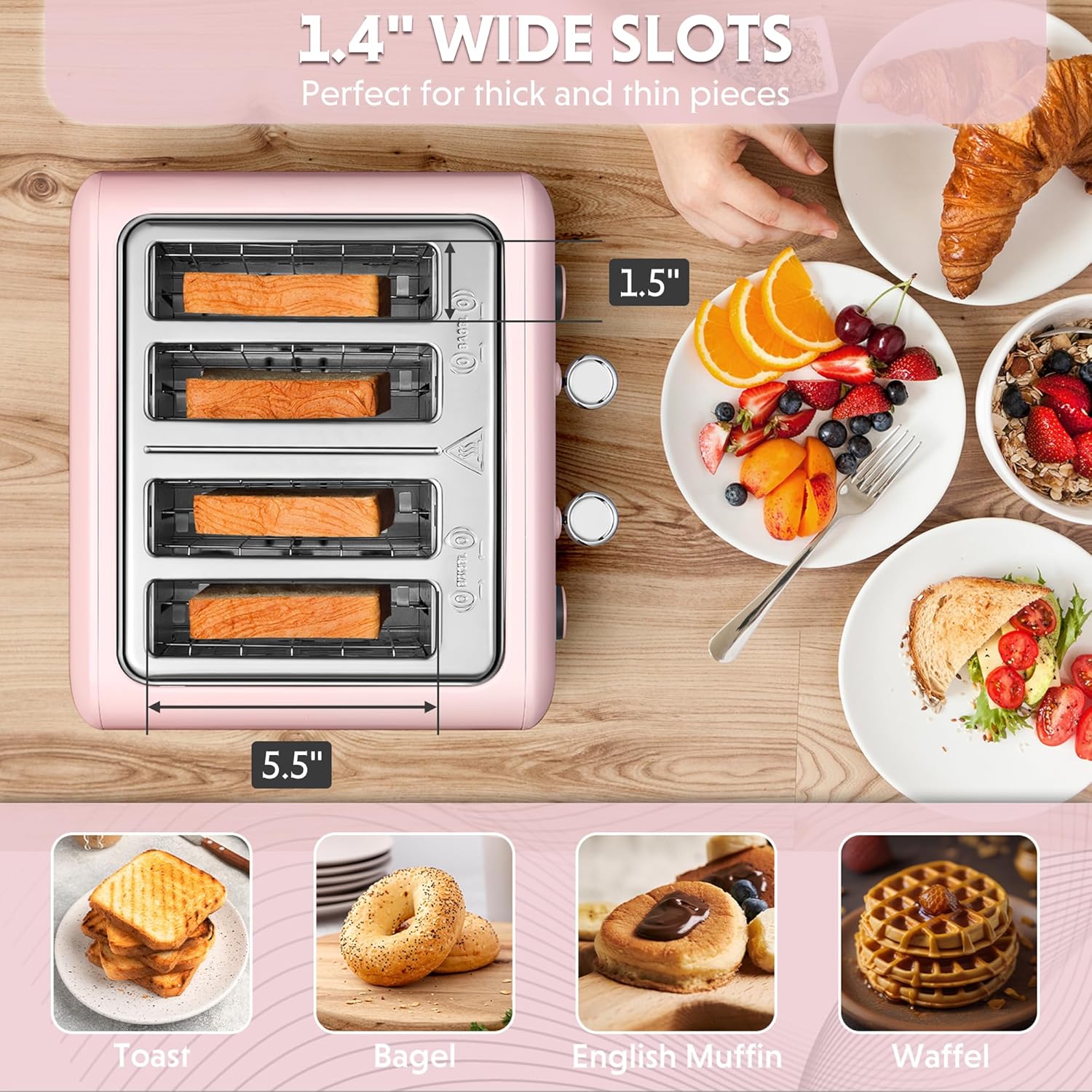 BUYDEEM DT640 4-Slice Toaster, Extra Wide Slots, Retro Stainless Steel with High Lift Lever, Bagel and Muffin Function, Removal Crumb Tray, 7-Shade Settings,Pink