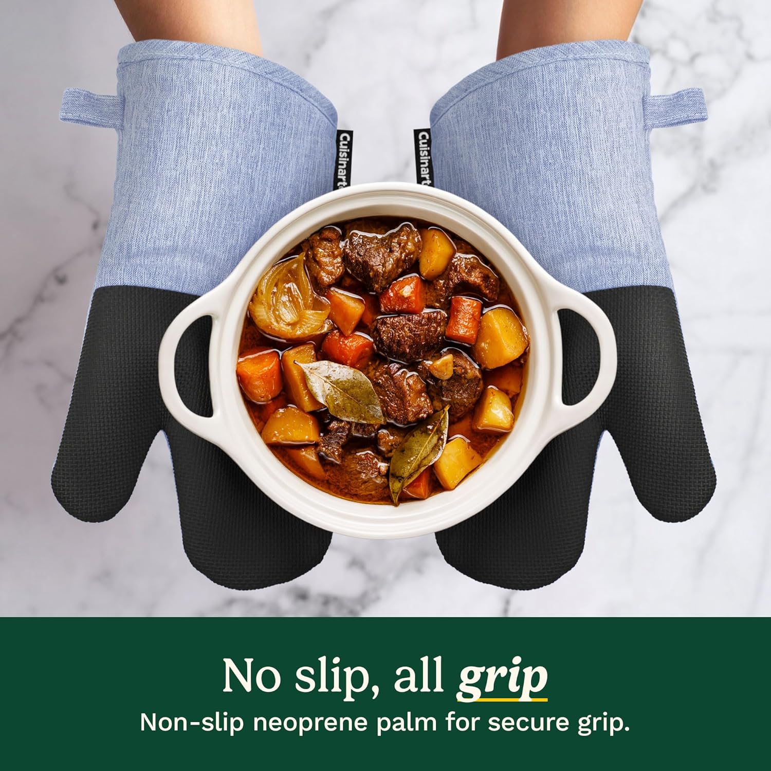 - COOK WITH CONFIDENCE: The Cuisinart Chambray Oven Mitt Set, measuring 7 x 13 inches, features a heat-resistant neoprene palm for superior protection (up to 350 degrees); handle hot cookware with ease and enjoy a secure grip with these oven mits, making cooking, baking, and grilling safer.