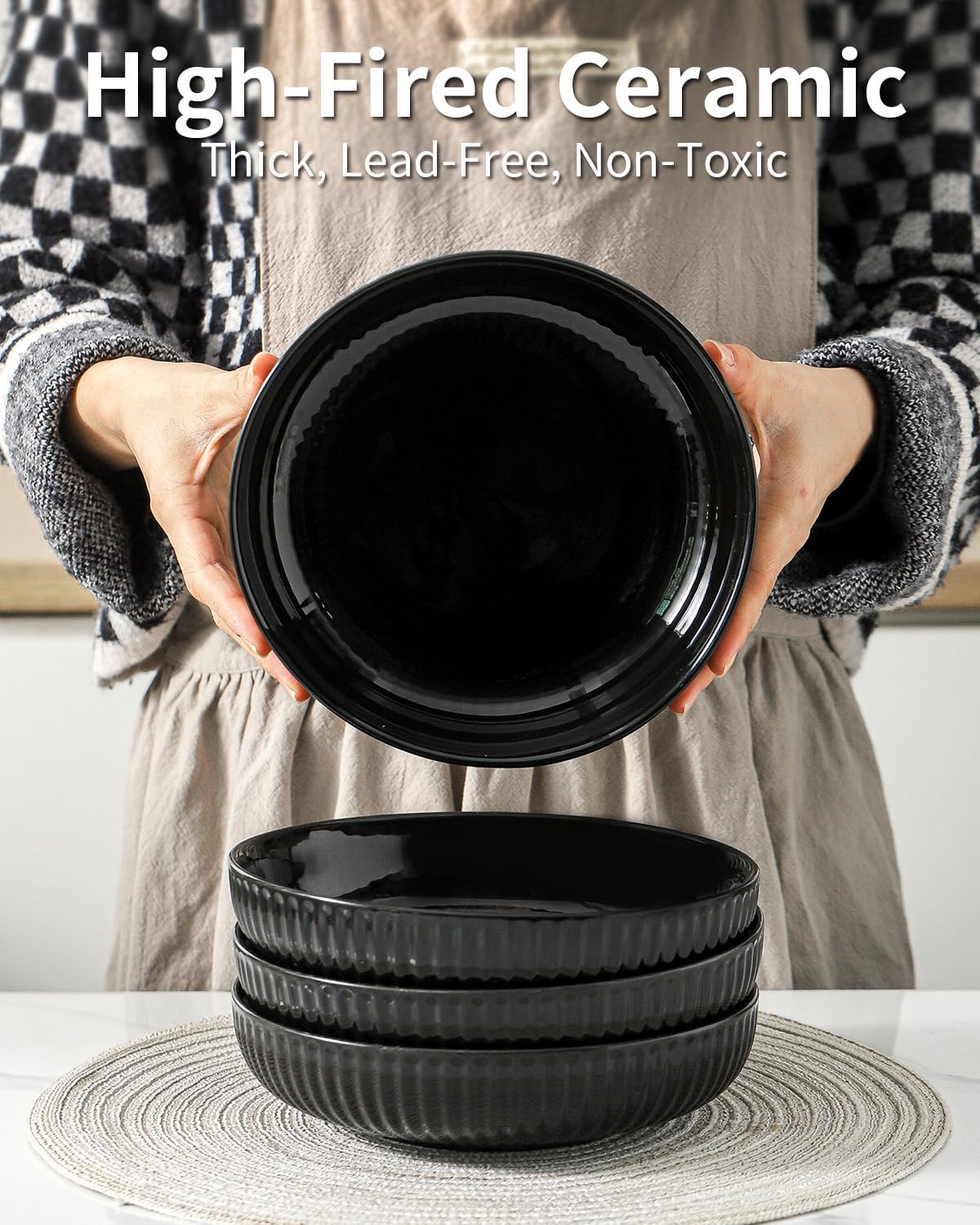 Hasense Pasta Bowls Set of 4, 30 oz Porcelain Dinner Bowls, Salad Bowls for Kitchen, Wide and Shallow Plates, Ideal Home Decor for Mother's Day Present, Microwave & Dishwasher, Oven Safe, Black