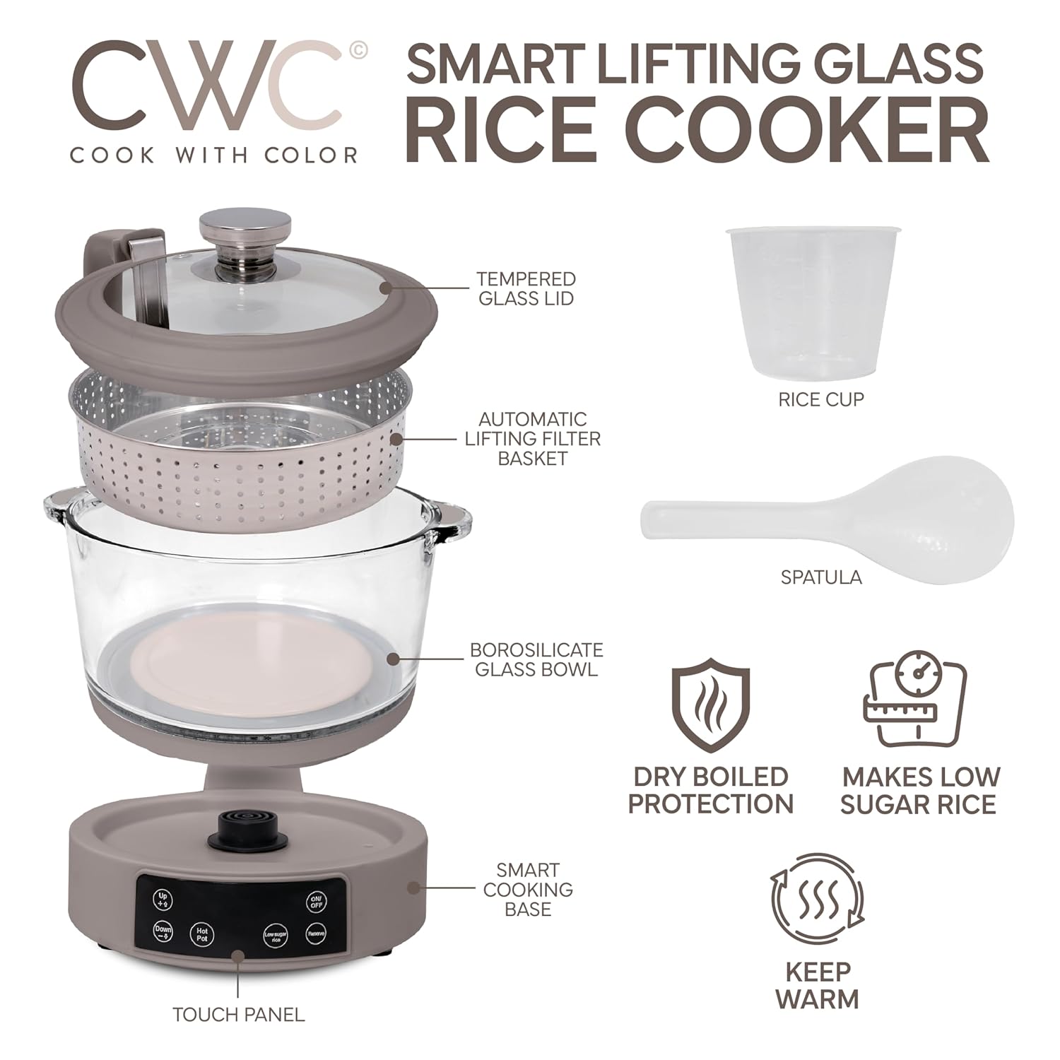 COOK WITH COLOR 3L Glass Low Carb Rice Cooker - Makes 6 Cups Cooked Low Sugar Rice with Auto Lift Filter Basket, Hotpot & Steamer for Rice, Grains and Oats, Digital Panel with Keep Warm, Greige