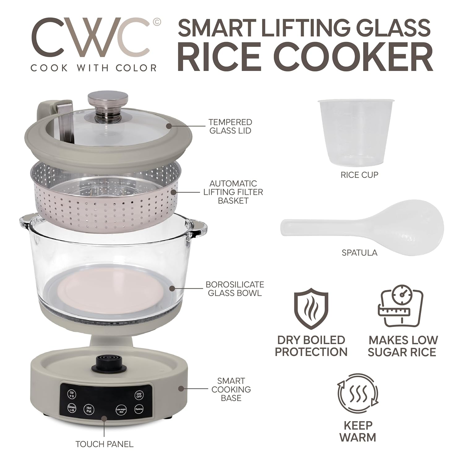 COOK WITH COLOR 3L Glass Low Carb Rice Cooker - Makes 6 Cups Cooked Low Sugar Rice with Auto Lift Filter Basket, Hotpot & Steamer for Rice, Grains and Oats, Digital Panel with Keep Warm, Sand
