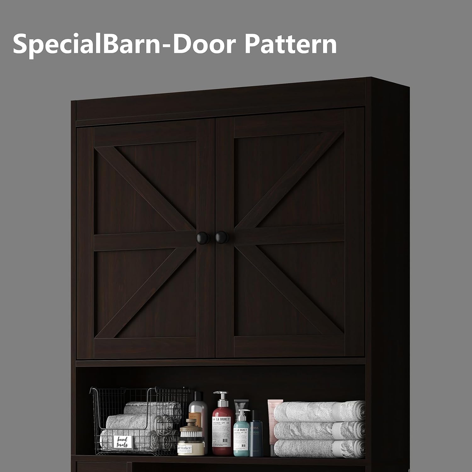 - Special Feature : Barn Doors, Toilet Paper Holder, Adjustable Bottom Bar, 6-Tier Freestanding