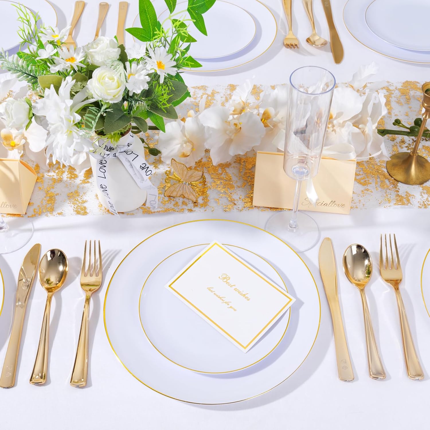 - ELEGANT DESIGN: These white plates with gold rims, which is an elegant design can increase the atmosphere of your party and make your party full of energy. Those gold plastic plates enhances the usability of the gold party plates
