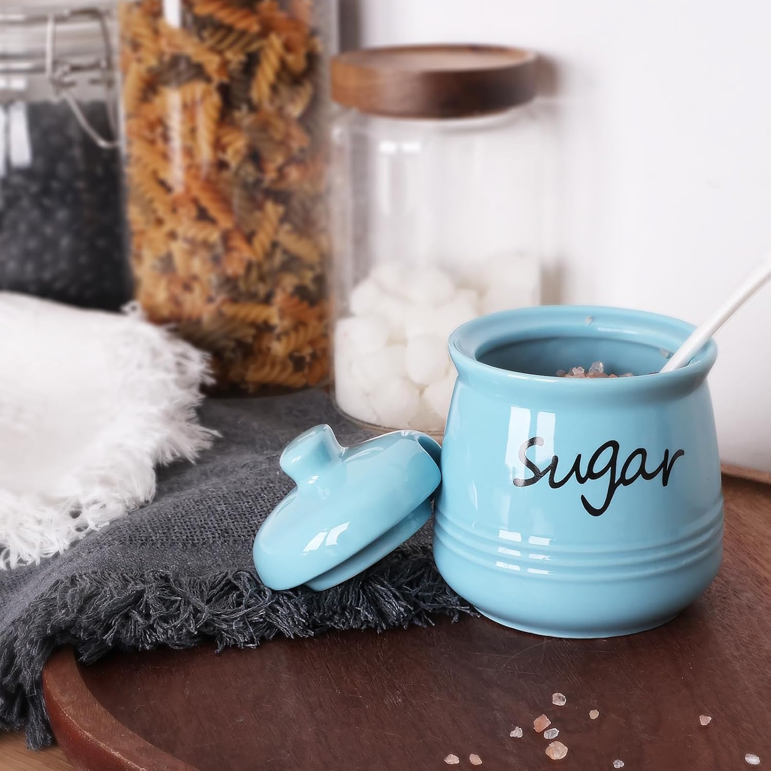 - DESIGN CONCEPT: This sugar bowl is equipped with a lid and a small spoon. The lid can keep your ingredients away from dust. There is a perfect notch on the lid for placing the spoon, so you don’t have to worry about placing the spoon randomly