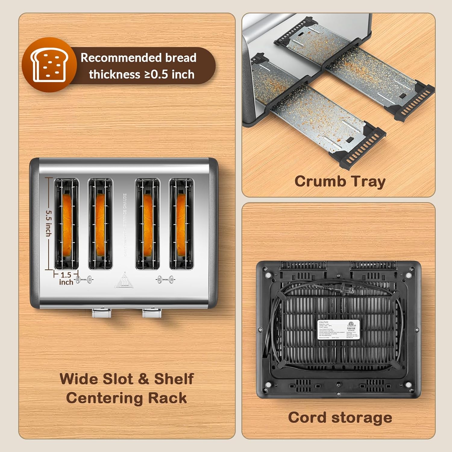 - 【Easy to Clean and Maintain】: The non-stick, food-grade stainless steel slots and removable crumb tray make cleaning this toaster a breeze. Spend less time maintaining your appliance and more time enjoying your perfectly toasted bread.