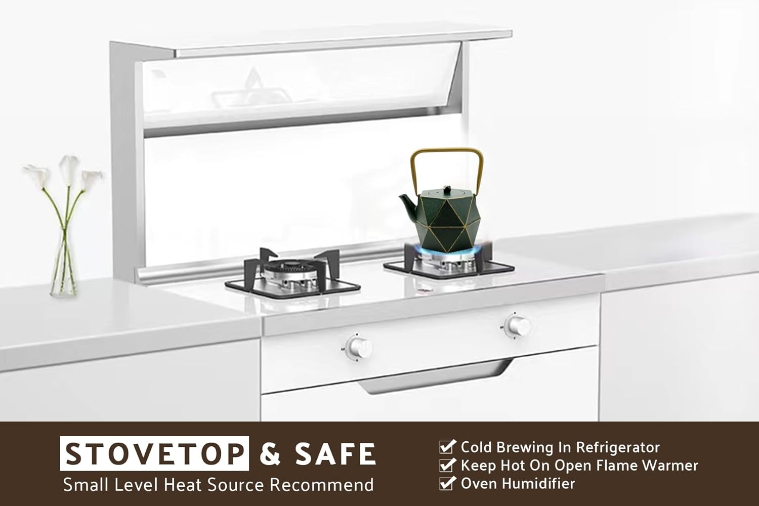 - 💎 Tea Kettle for Stovetop - The cast iron tea kettle is sturdy and protects the teapot from shattering, which is more sturdy than the general glass/ceramic teapot. The fully enameled interior helps to taste the original and delicious tea. HEAT SOURCE: Induction Cooker, Electric Stovetop, Ceramic Stove Top, Gas Stovetop Safe, As a Humidifier Wood Burning Stove, Halogen Cooker, Fireplace for Humifying Moisture in the Air. Note: Low heat/Moderate heat is suggested, PROHIBITION OF DRY BURNING.
