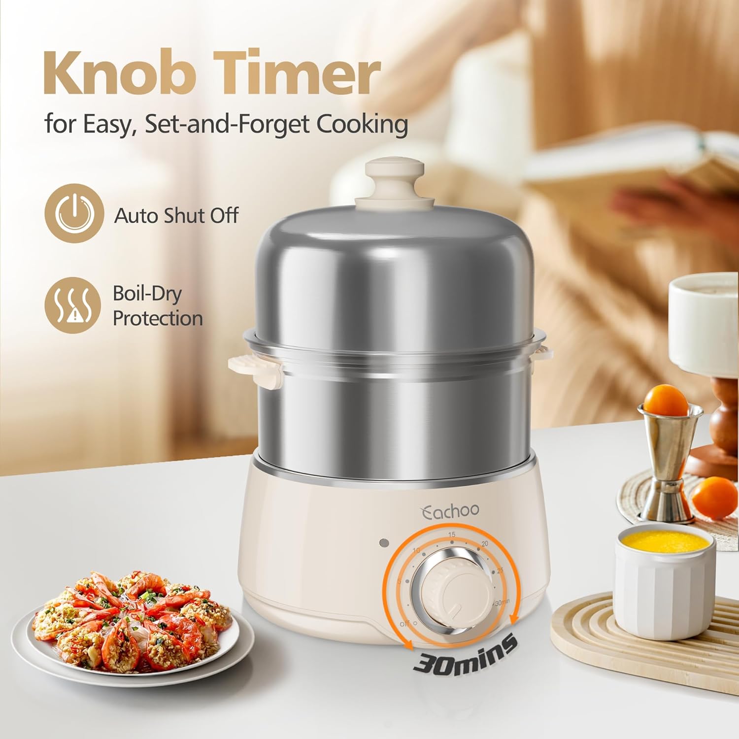 Hard Boiled Egg Cooker - CACHOO 14-Egg Rapid Stainless Steel Egg Boiler with 30-Min Timer & Auto Shut Off, Compact Electric Vegetable Steamer for Cooking, Dishwasher Safe, Beige