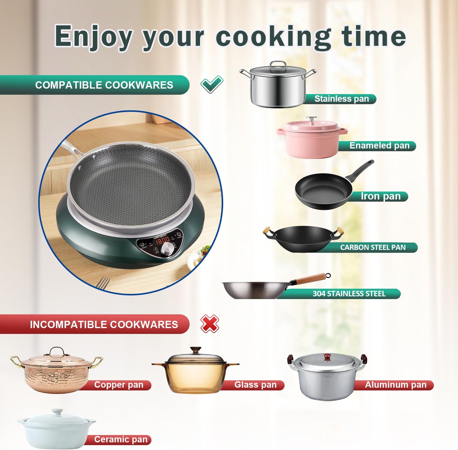 - 【Flat Bottom Pan Induction Cooker for Cooking】: FCC Certified. The Abangdun 85V-175V Induction Cooktop is suitable for all North American households and commercial applications. Compared to traditional electric stoves, hot plates, and burners of the same power, induction cooktops are significantly more energy-efficient, saving time during cooking. Warning: Place cookware on the cooktop before turning on the induction cooker.Otherwise, it will display an E1 error.