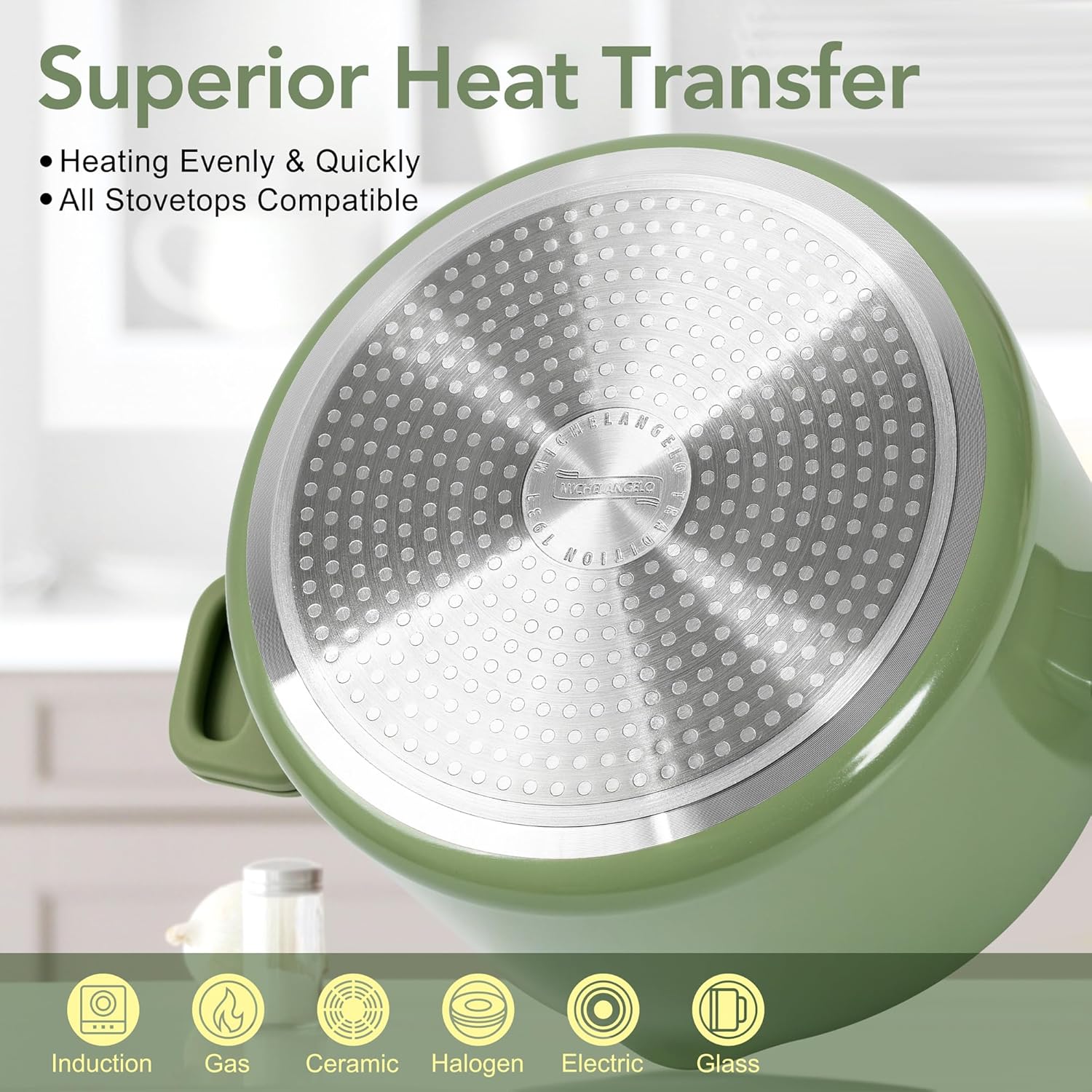 MICHELANGELO Pasta Pot with Strainer Lid - 6 Quart Cooking Pot with Lid, Non Stick Spaghetti Pot Ceramic Coated with Twist and Lock Handles for Easy Draining, Induction Compatible, Roden Green