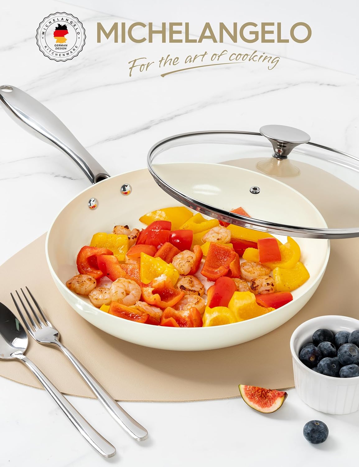 MICHELANGELO 12 Inch Frying Pan with Lid, Large Nonstick Skillet with Ergonomic Handle, Non-Toxic Ceramic Fry Pan, Oven-Safe, White