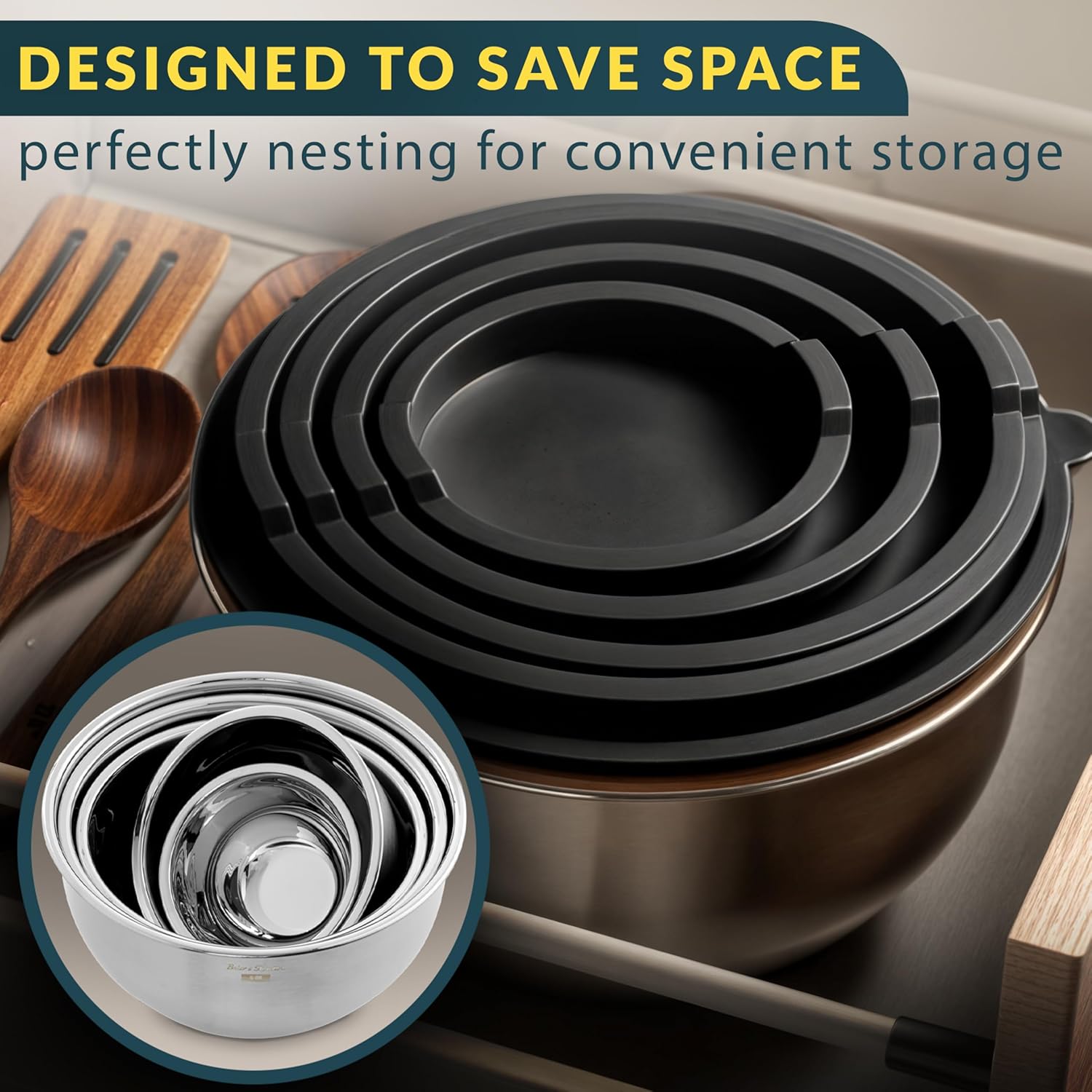 - PREMIUM STAINLESS STEEL QUALITY: Crafted from high-grade, non toxic stainless steel, each mixing bowl stainless steel is durable yet lightweight. The metal mixing bowl lid and non slip silicone bottoms ensure secure, stable use during food prep.
