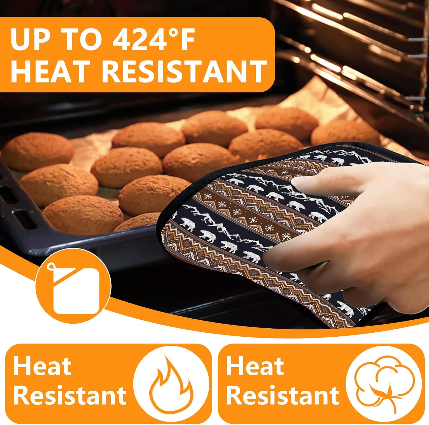 Vintage Rustic Bear Oven Mitts and Pot Holders Sets 4Pcs,Extra Long Oven Gloves Potholder for Kitchen Cooking Baking BBQ 100% Cotton Heat Resistant