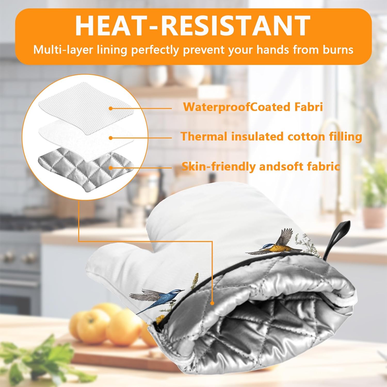 Wildflowers Birds Oven Mitts and Pot Holders Sets 4Pcs,Extra Long Oven Gloves Potholder for Kitchen Cooking Baking BBQ 100% Cotton Heat Resistant