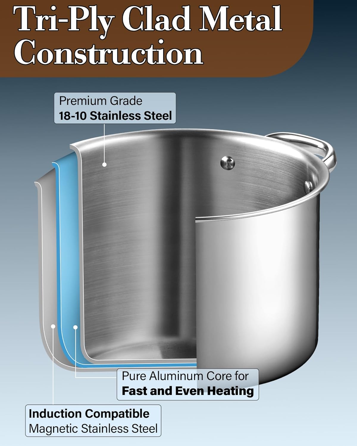 - Tri-Ply Clad: 12 quart stockpot is made of 18/10 stainless steel inner layer, aluminum core and megnetic stainless steel outer layer, which ensures good thermal conductivity and even heat distribution, helping food heat up quickly and evenly