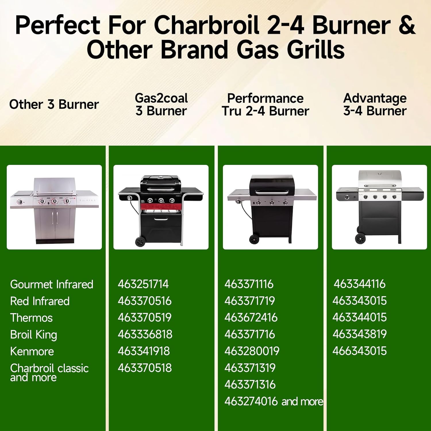 - Fits for Gas2coal: Grill grates replacement fit for Charbroil Gas2coal 463340516, 463370516, 463336818, 463341918, 463370519, 463370518, 466370516. Fits for Charbroil 3 Burner. Fits for Charbroil Performance 3 burner grills 463371116, 463371116-P1, 463371316, 463370015, 463470109, 463672416. Fits for Charbroil Red 3 burner grill 466250511, 463250511, 463250510, 466250509, 463250509. Fits for Charbroil Performance 3 burner grills 463371116, 463371116-P1, 463371316, 463370015, 463470109, 463672416