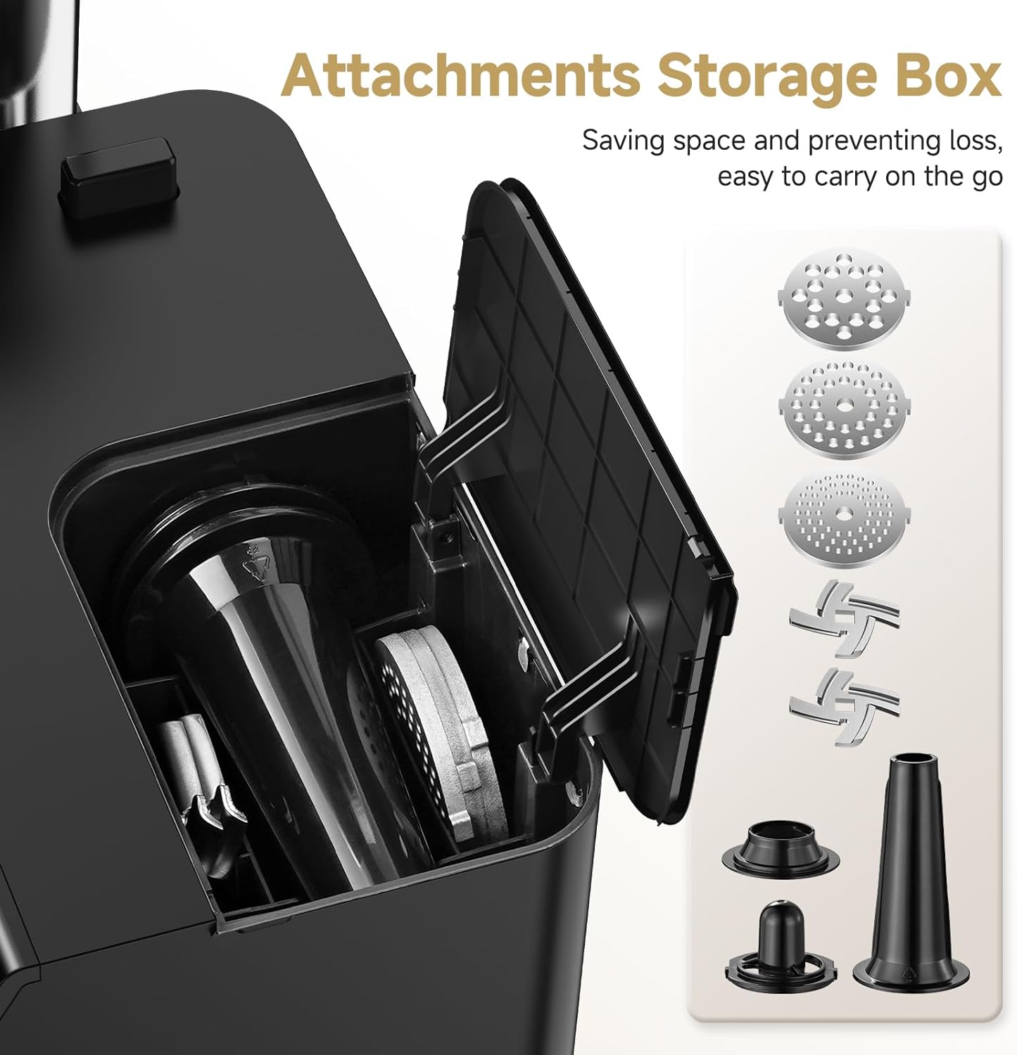 - Built-in Storage & Multiple Accessories: This meat grinder for home use comes with built-in storage to keep all accessories organized, including 2 blades, 3 grinding plates, a sausage& kibbe attachment. No more messy kitchens—everything you need is neatly stored in one place