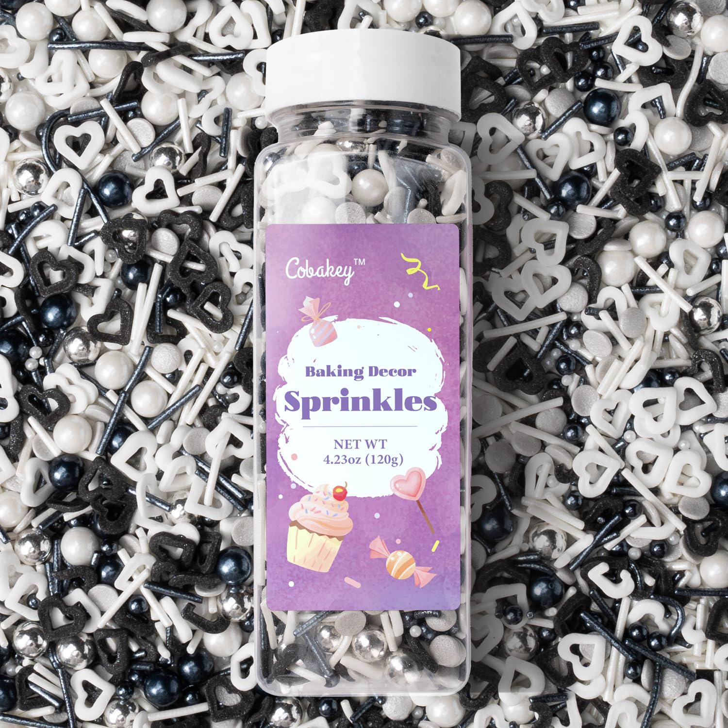 Black and White Heart Sprinkles for Cake Decorating 4.23ounce - Sugar Mix Contains Heart & Silver Pearl Sprinkles for Cupcake Toppers, Ice Cream, Candy, Cookie Decorations - Holiday Party Supplies
