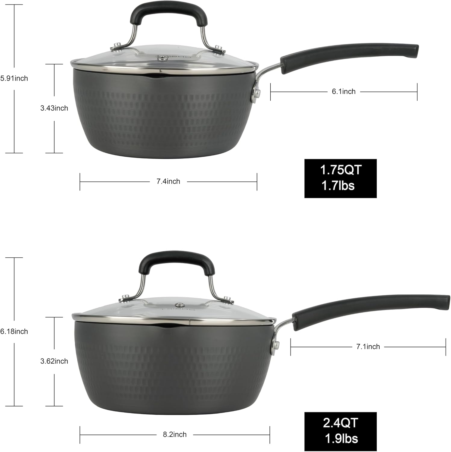 - Size:The sauce pots come in three different sizes: 1.25QT/1.75QT/2.4QT, catering to your various food preparation needs. Whether you're boiling pasta, making sauce, preparing meats, or stir-frying leftovers, these frying pans can do it all