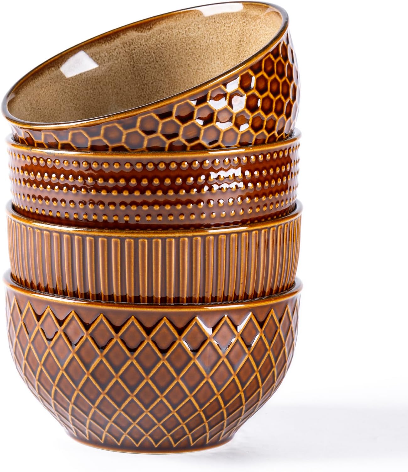 GBHOME Stoneware Cereal Bowls Set of 4, 24 oz Ceramic Soup Bowls with Texture Patterns for Soup,Oatmeal,Snack Perfect for Wedding, House-warming Gift - Caramel