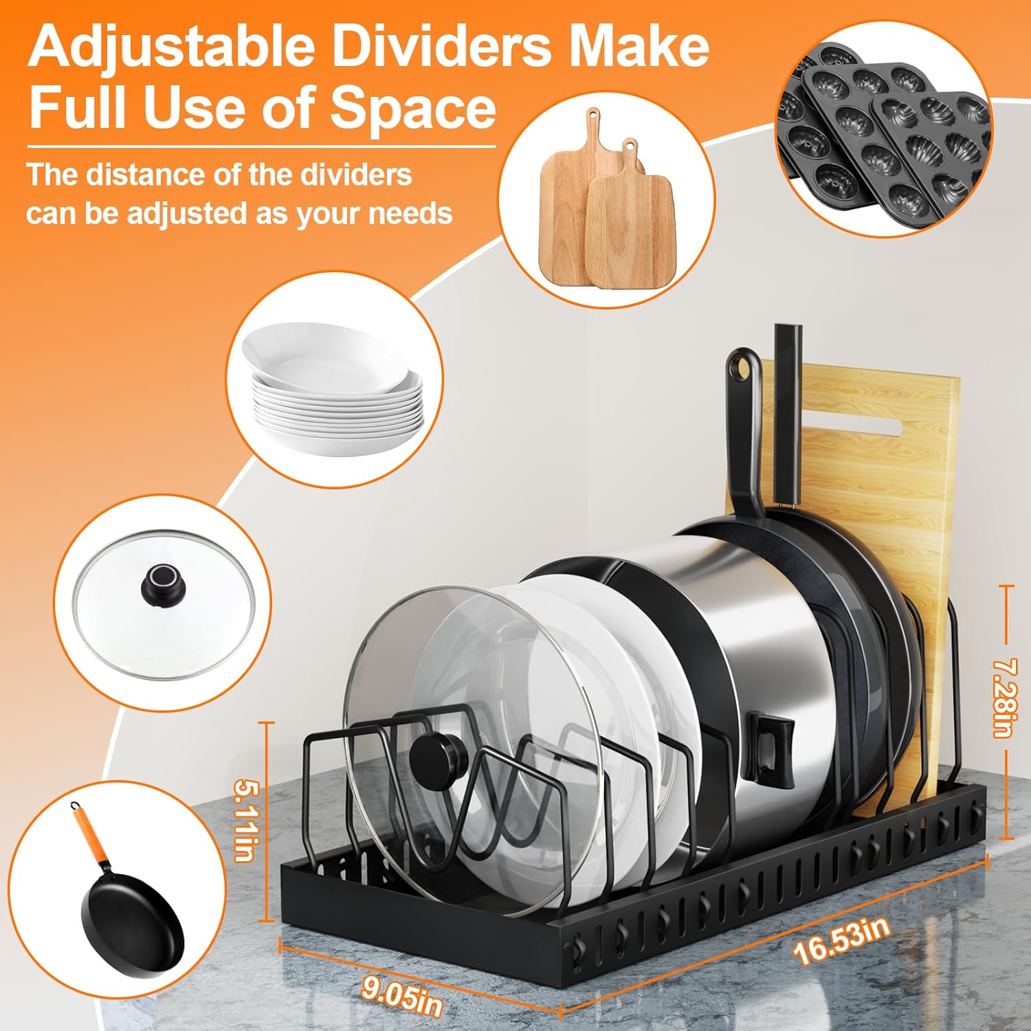 - 【Easy to Pull and Store】Per pot and pan organizer features a sliding rail and built-in pulley ball design. With a gentle pull, you can store or remove kitchen utensils, and no longer have to squat down to search for and organize them