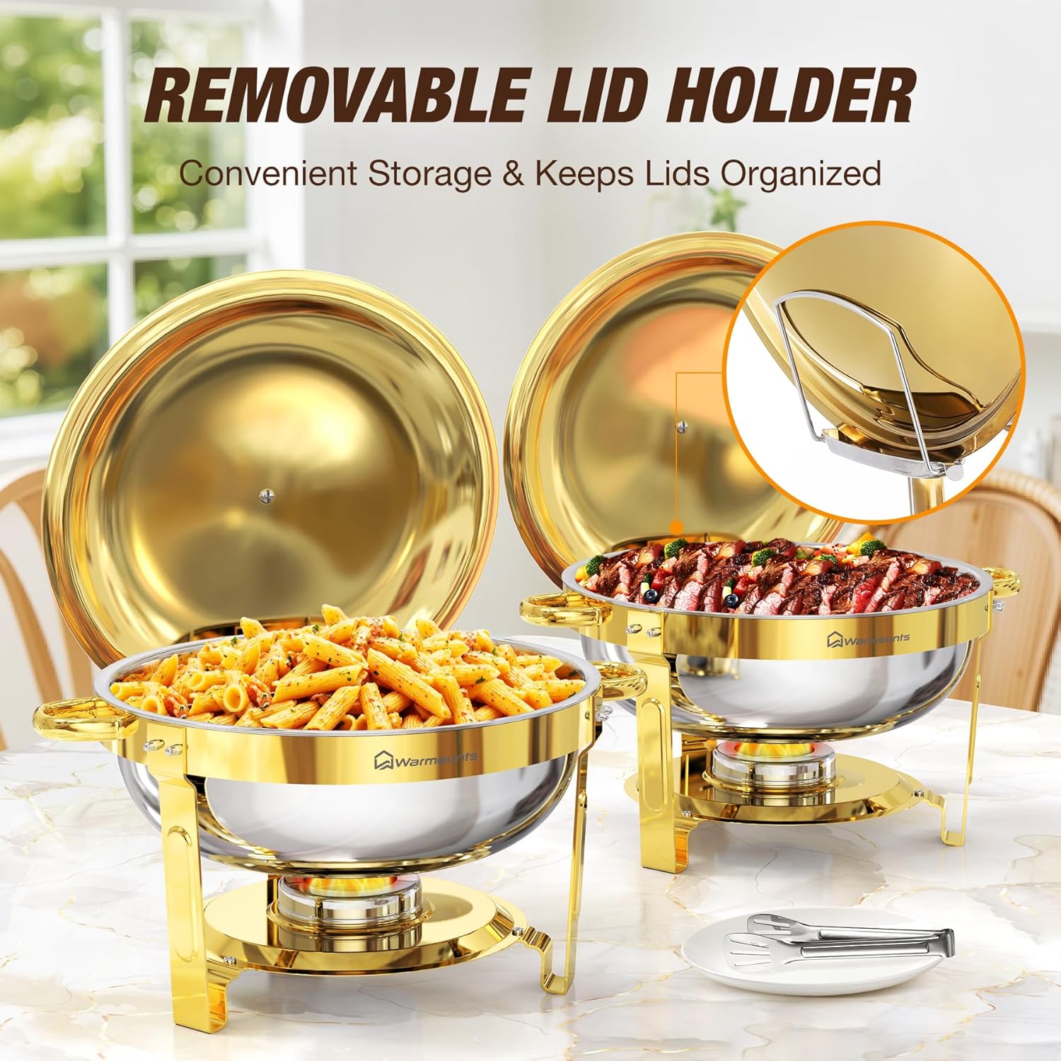 Gold Chafing Dishes for Buffet (5QT, 4 Pack), Round Chafers and Buffet Warmers Sets with Lid Holder, Food-Grade Stainless Steel, Rolled Edge Design, for Catering Events, Parties, Weddings