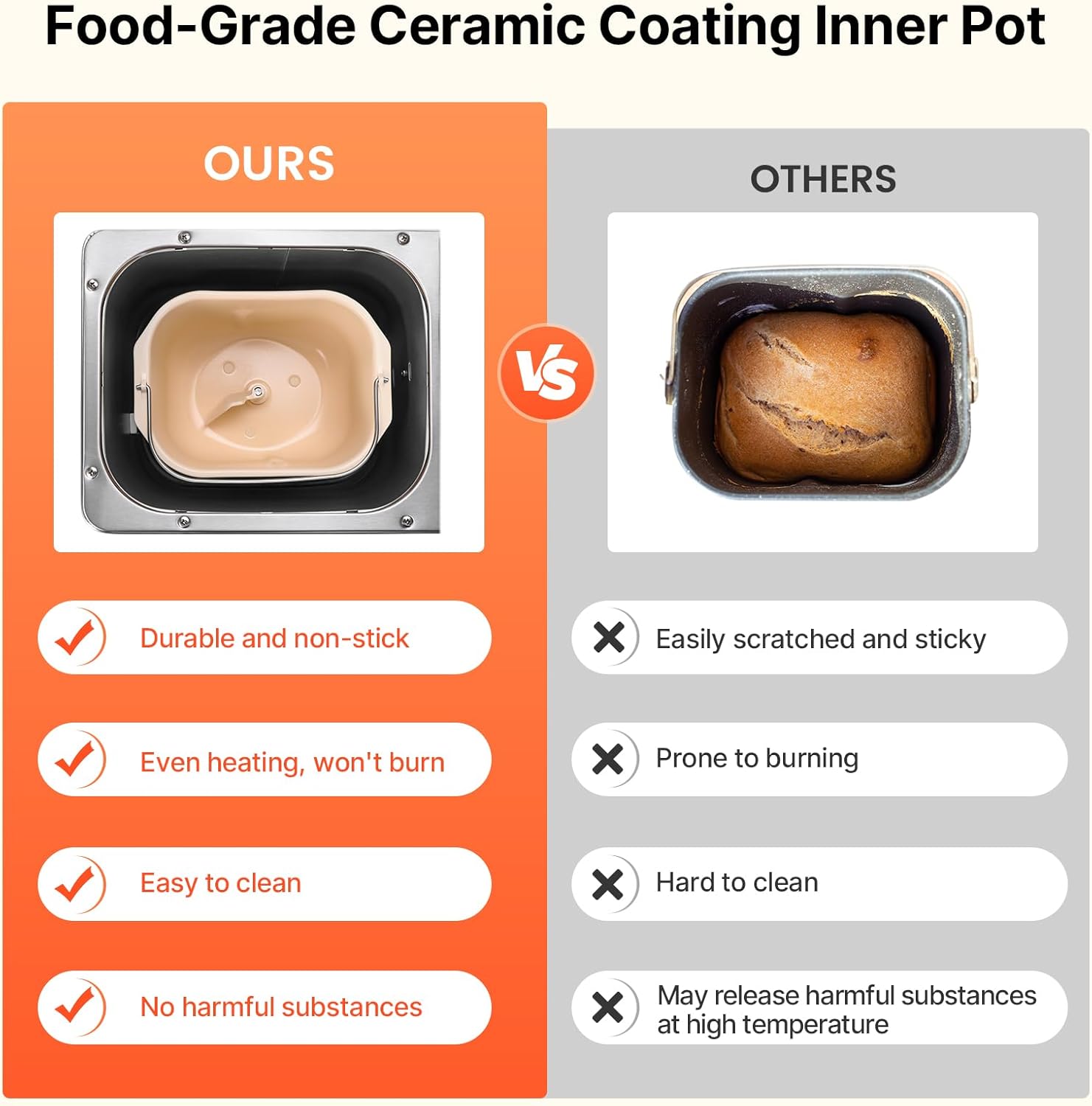 - Food-Grade Ceramic Inner Pot: The inner pot is crucial for your health and safety. We use a food-grade ceramic inner pot, which is heat-resistant and will not release harmful substances. It is durable, non-stick, and the coating is not easy to peel off, ensuring no burning even after prolonged use. The mixing blade is also made of food-grade Teflon material, which is safe and harmless. Every baking process takes care of your health, ensuring peace of mind with every bite.