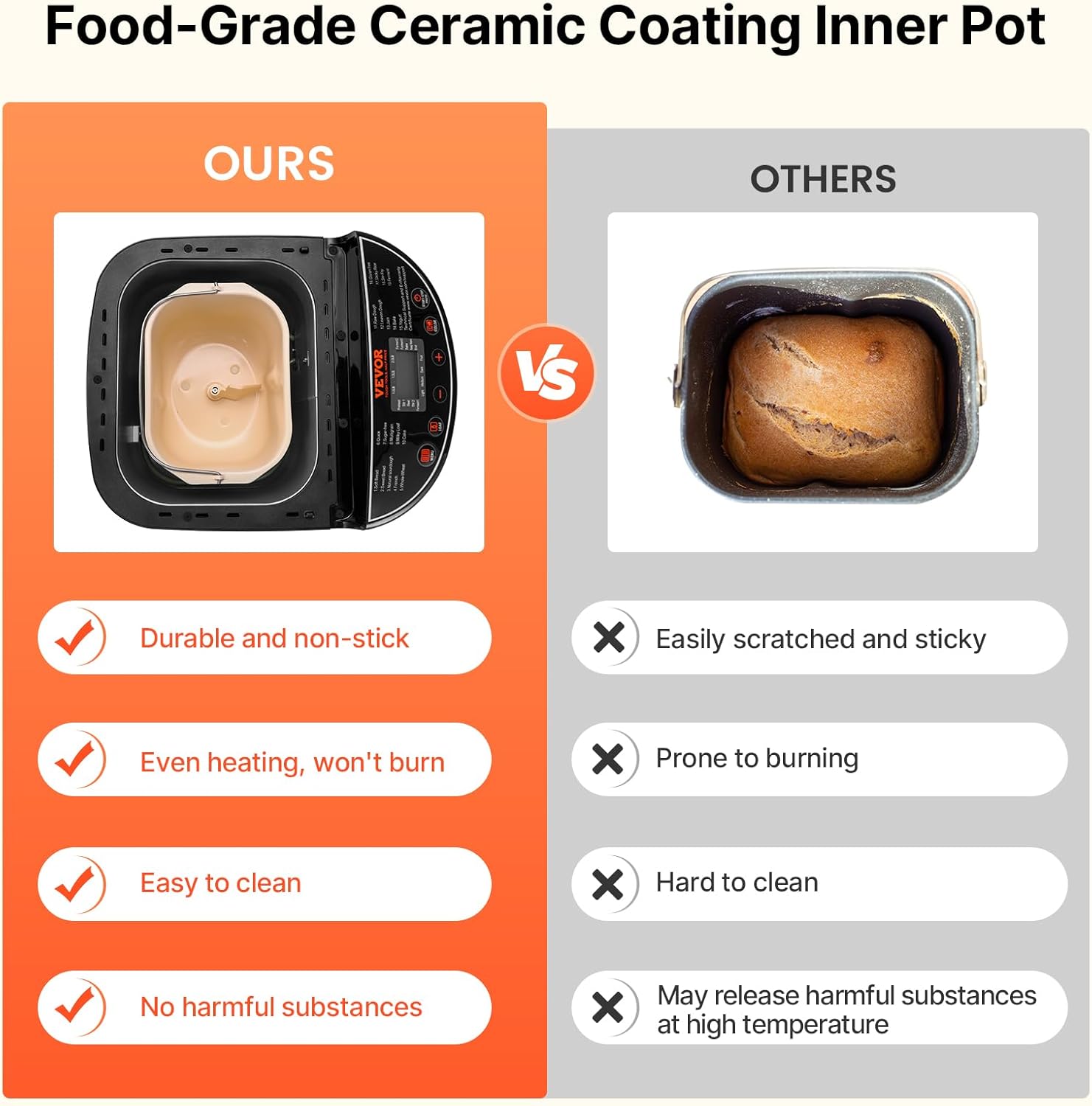 VEVOR Bread Maker, 19-in-1 2LB Dough Machine, Nonstick Ceramic Pan Automatic Breadmaker with Gluten Free Setting, Whole Wheat Bread Making, Digital, Programmable, 3 Loaf Sizes, 3 Crust Colors