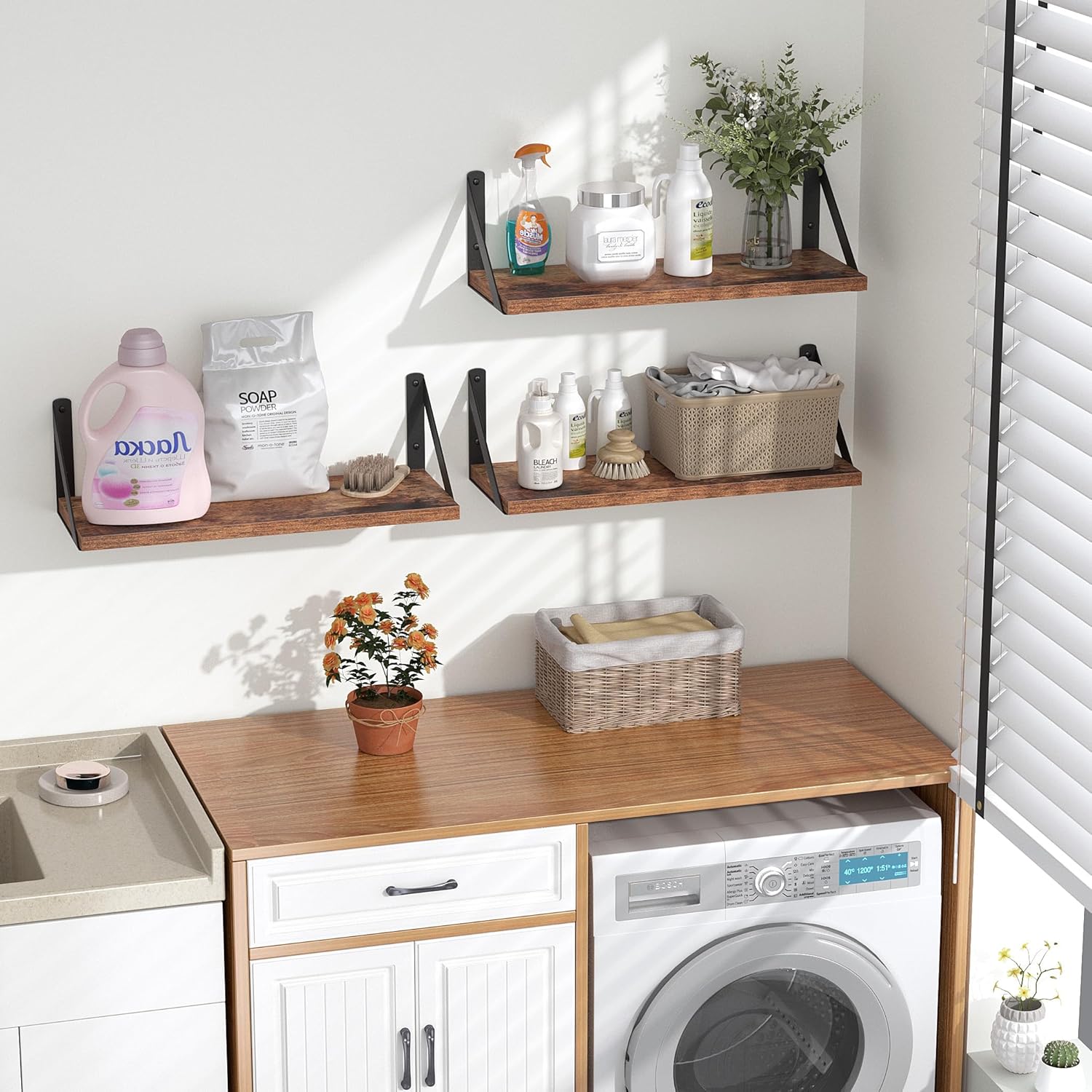 - 【MULTIFUNCTIONAL WALL SHELF】The floating shelves can turn a small area into an organized space, providing storage space for bedroom, bathroom, kitchen, easily placing greenery, books, crafts, spice jars, toiletries