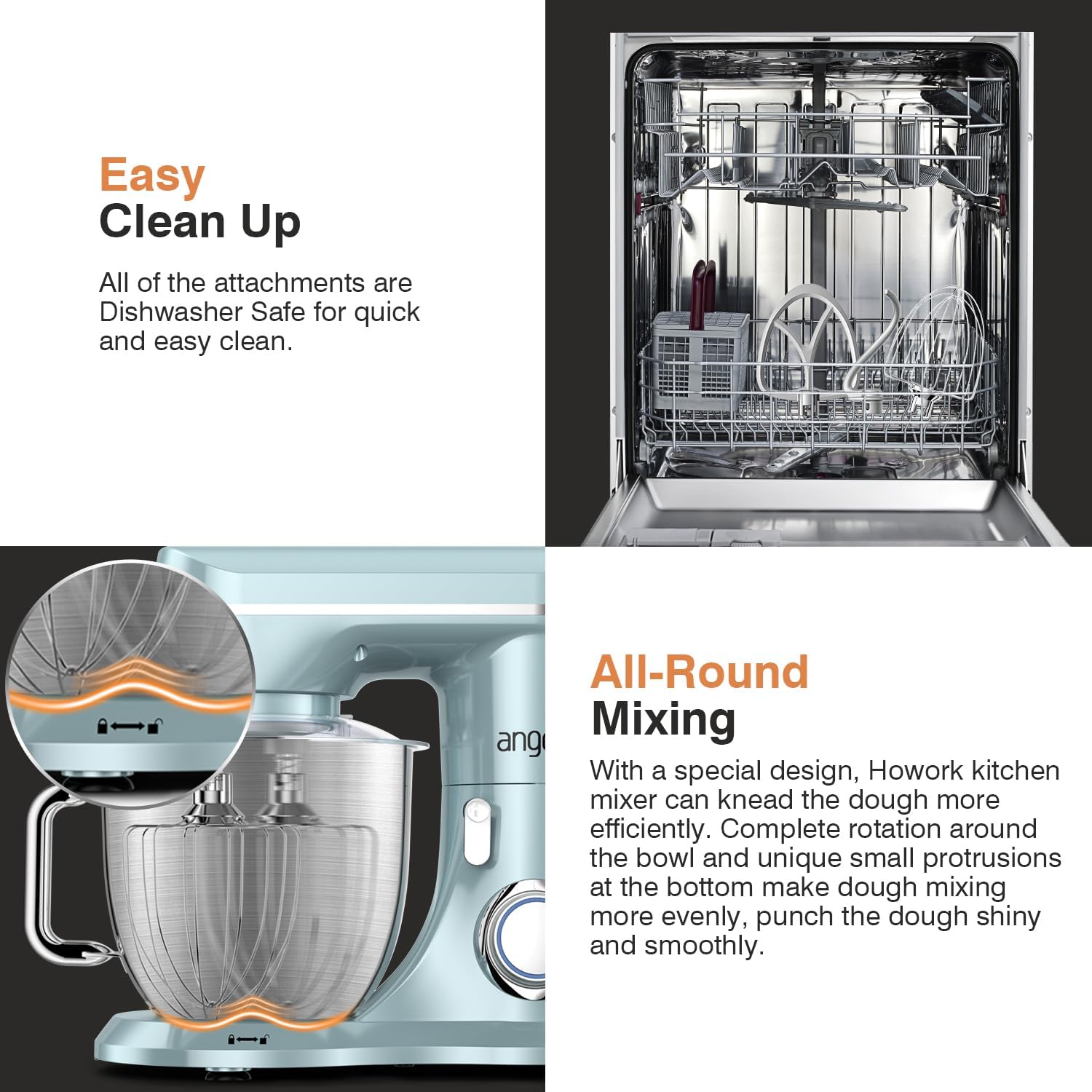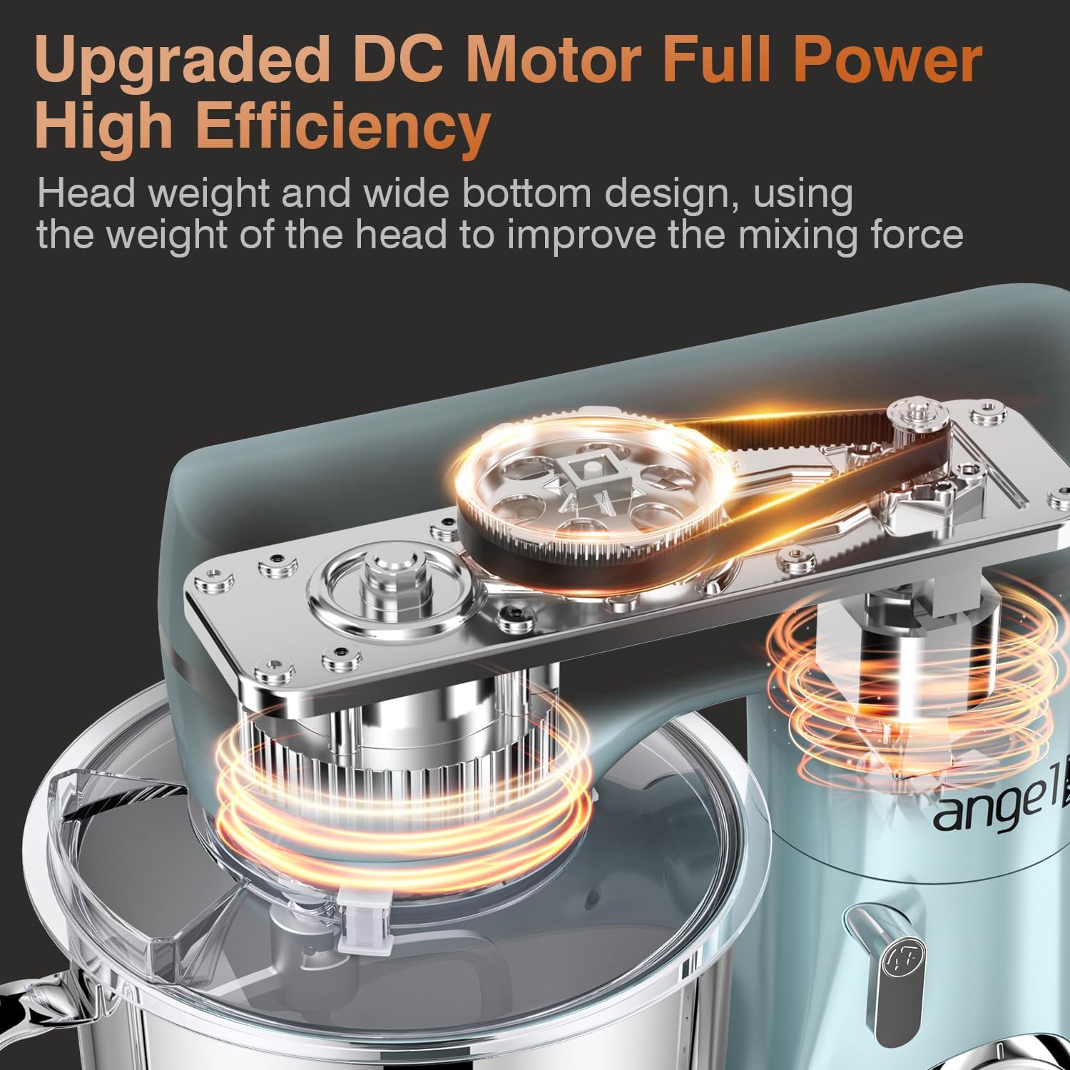 - 【Upgrated DC Motor System 】Mini Angel stand mixers adopt all metal gear structure, with closed gearbox, effectively reduce the sound, speed running stable without stalling with can long service life. And the planetary mixing system which functions more touch points per rotation during mixing process, so that all the mix is stirred at a full extent.