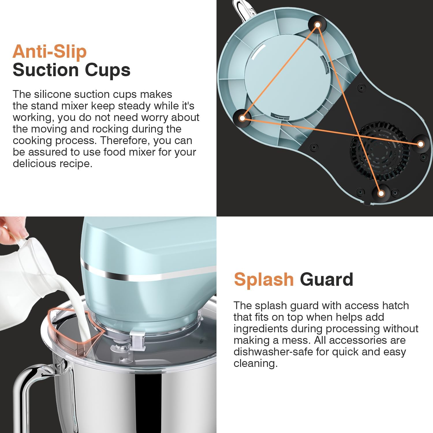 - 【Tilt-head & Anti-slip Design】The tilt-head design means that you can automatically power off when you look up, directly add ingredients or replace accessories to protect the safety of you and your family. Non-slip silicone suction cups design keep the machine steady and avoid moving or bounce during operation.
