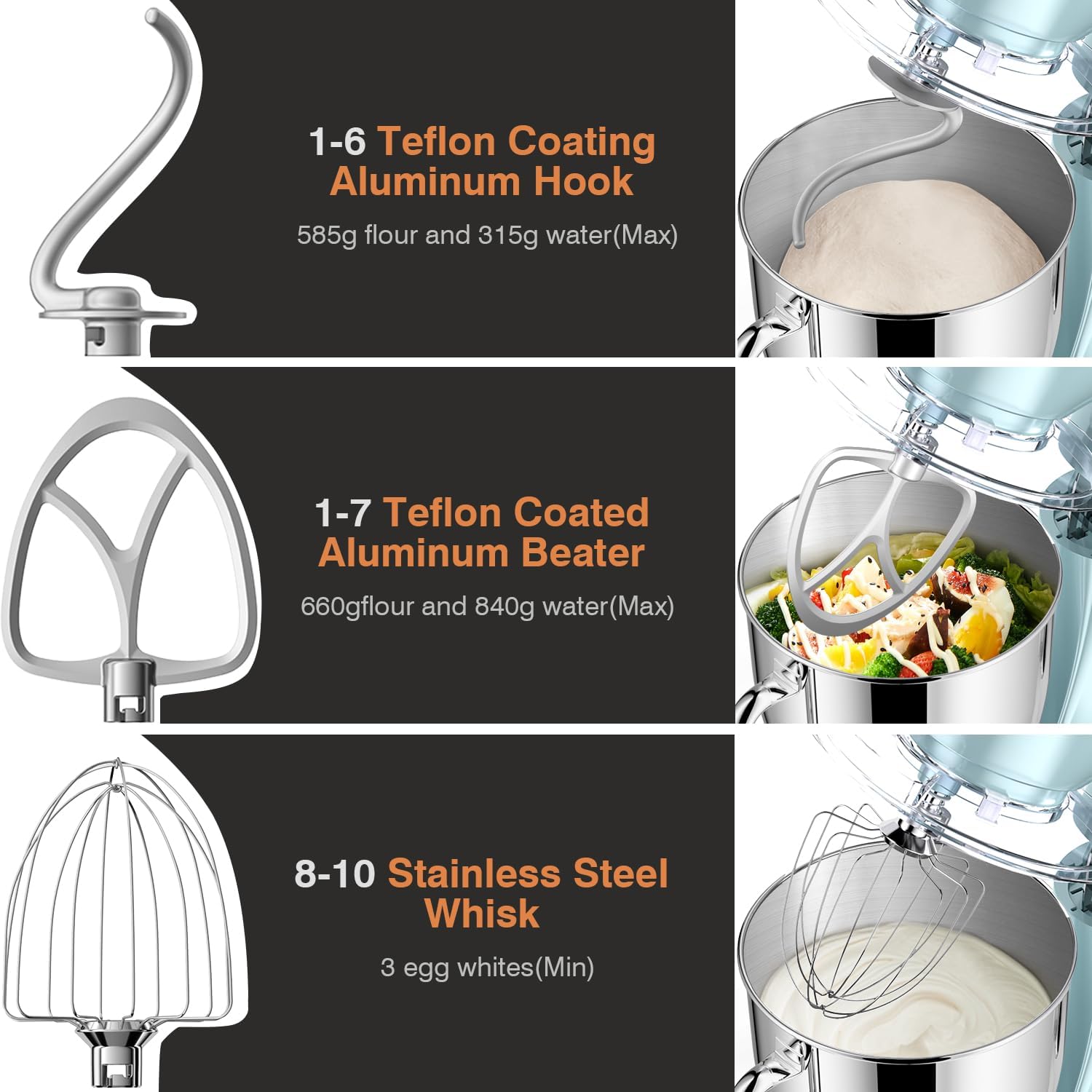 - 【3+1 Attachments, Easy to Clean】Compared with chef machines of the same type, our dough hooks and mixing beater cleanups quickly with a safe, non-stick coating that leaves no trace elements in your food. And it will not turn black after repeated use. For the whisk, wash it with your hand. Besides, the scraper helps you easy to take out the food and clean the bowl.