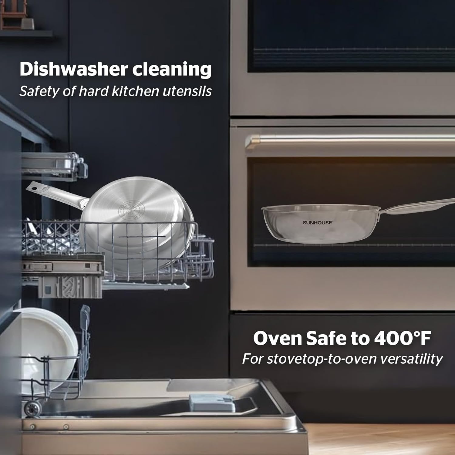 Sunhouse 18/10 11 Inch Stainless Steel Frying Pan, Whole-Clad No Coatings Skillet with Stay-cool Handle for Cooking, Durable & Oven Safe to 500°F, Dishwasher Safe, Compatible with All Cooktops