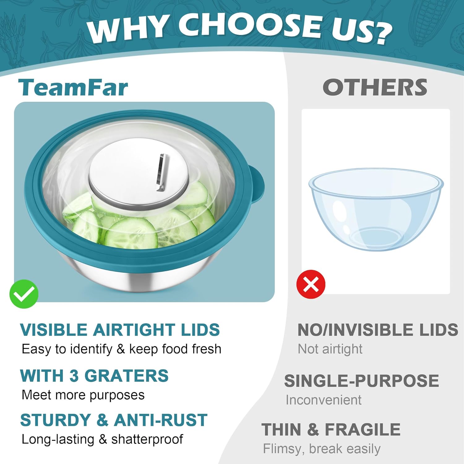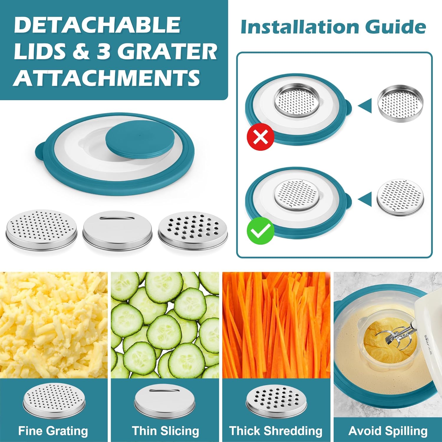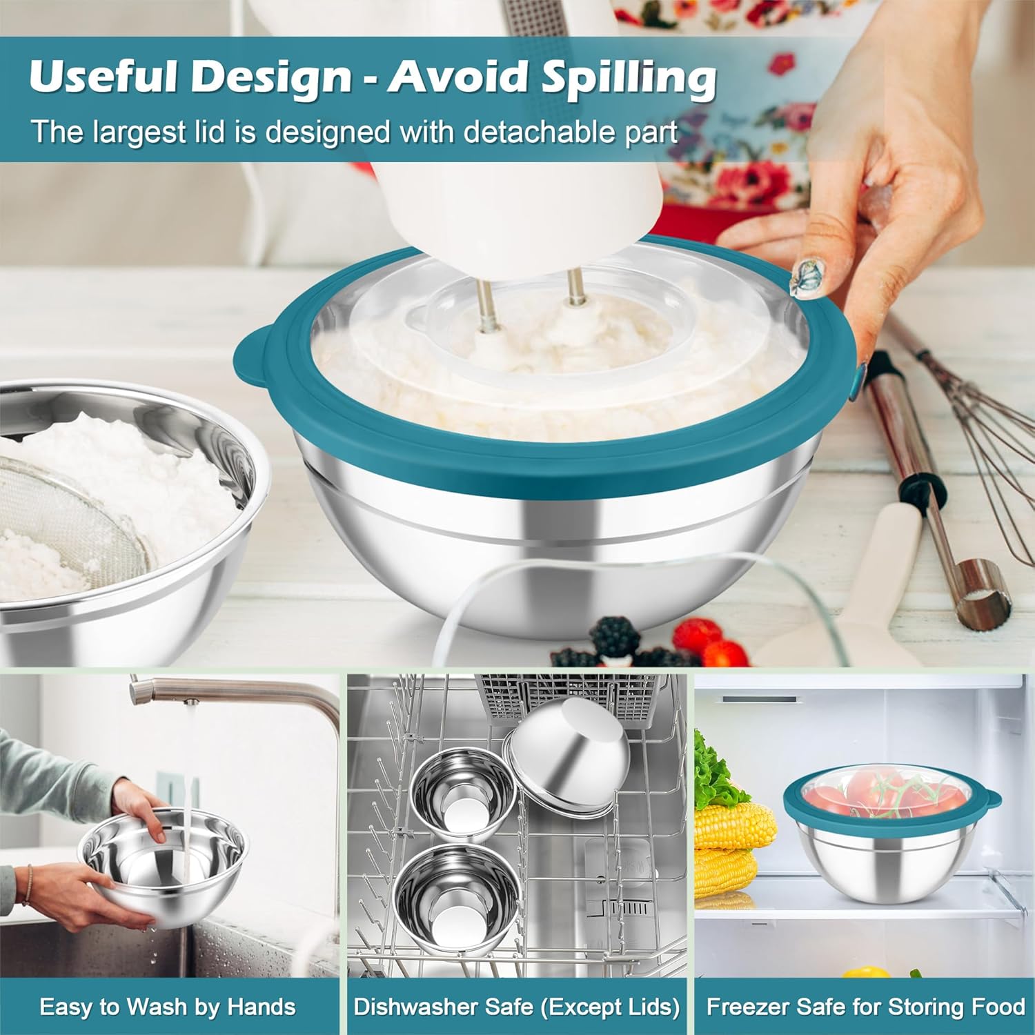 - TRANSPARENT LIDS & 3 GRATERS: Every stainless steel mixing bowl offers a visible clear tight-fitting lid, Easy to see through and identify what’s in the bowl, Leak-proof to prevent liquid spills, Ideal for storing food in freezer to keep it fresh and clean, The largest lid has a detachable section, 3 grater attachments can be simply placed directly on the center of lid for slicing /grating /shredding, Practical for meal-preparing, No need to take away the entire lid to avoid splashing or spilling when whisking