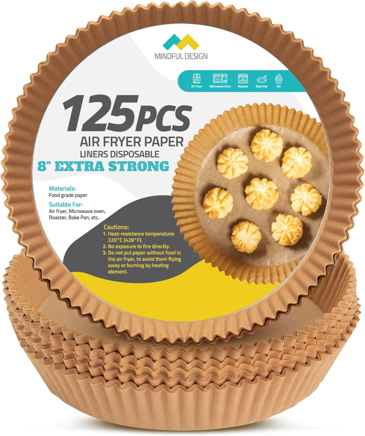 Mindful Design Air Fryer Paper Liners,125Pcs Parchment Paper, Air Fryer Disposable Liner for Microwave, Non-Stick Round Free of Bleach (8IN)