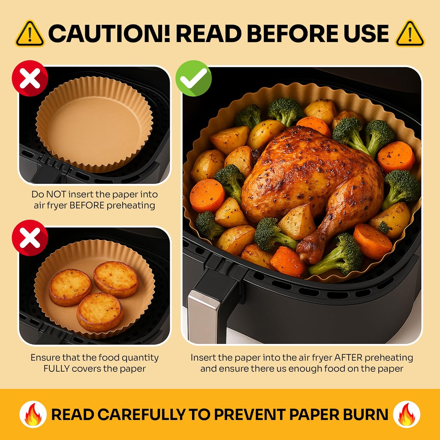 - Warning: Do not preheat your Air Fryer with the liner in the basket. First preheat your Air Fryer, then place the liner in with the food