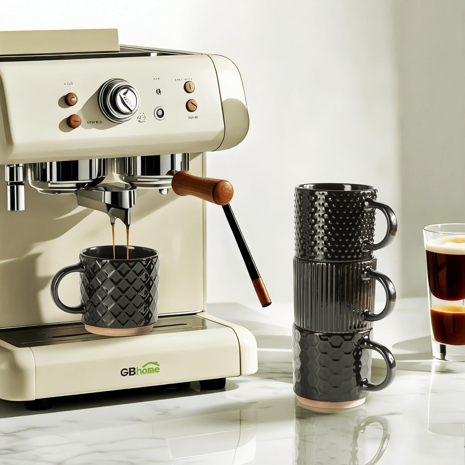 GBHOME 12OZ Stackable Coffee Mugs with Stand, Ceramic Coffee Mugs with Texture Patterns for Man,Woman,Dad,Mom, Modern Coffee Cups Set of 4 for Latte/Cappuccino/Cocoa. Dishwasher&Microwave Safe,Black