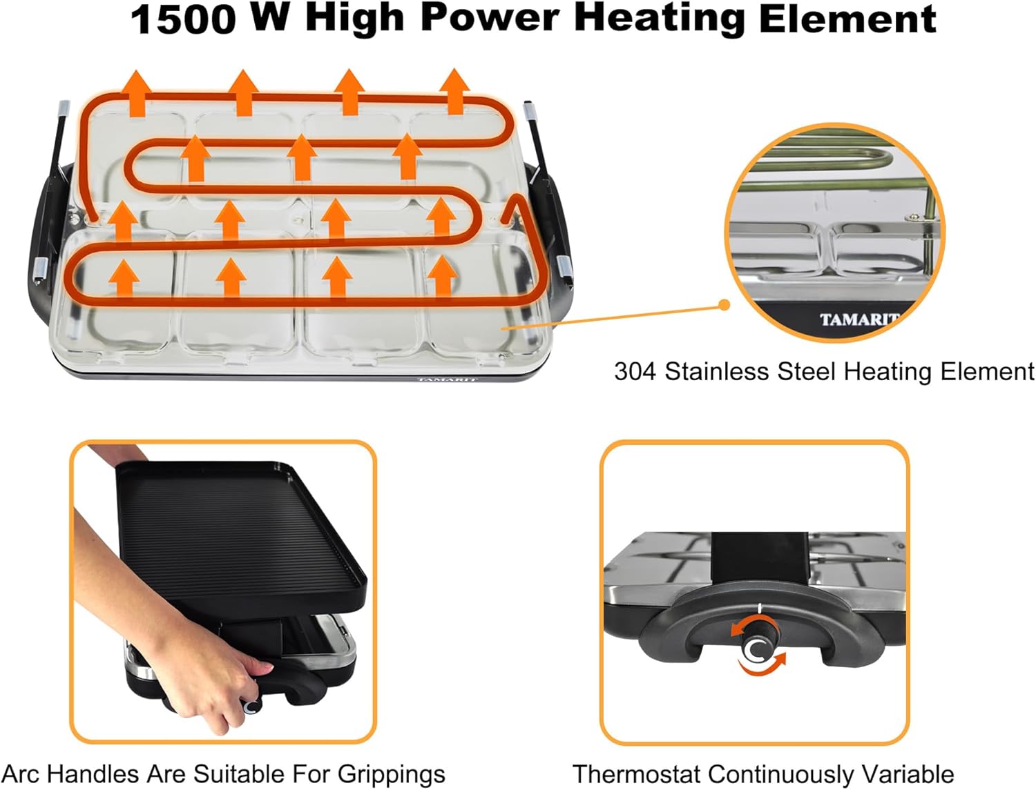 - Powerful 1500W Heating & Easy Cleaning: This 1500W high-power indoor grill delivers fast, even heat for melting raclette cheese perfectly and quickly grilling meats, veggies, pizza, seafood and more. The non-stick reversible grill plate and 8 non-stick raclette cheese trays detach effortlessly. Simply wash under running water or place in the dishwasher for hassle-free cleanup.