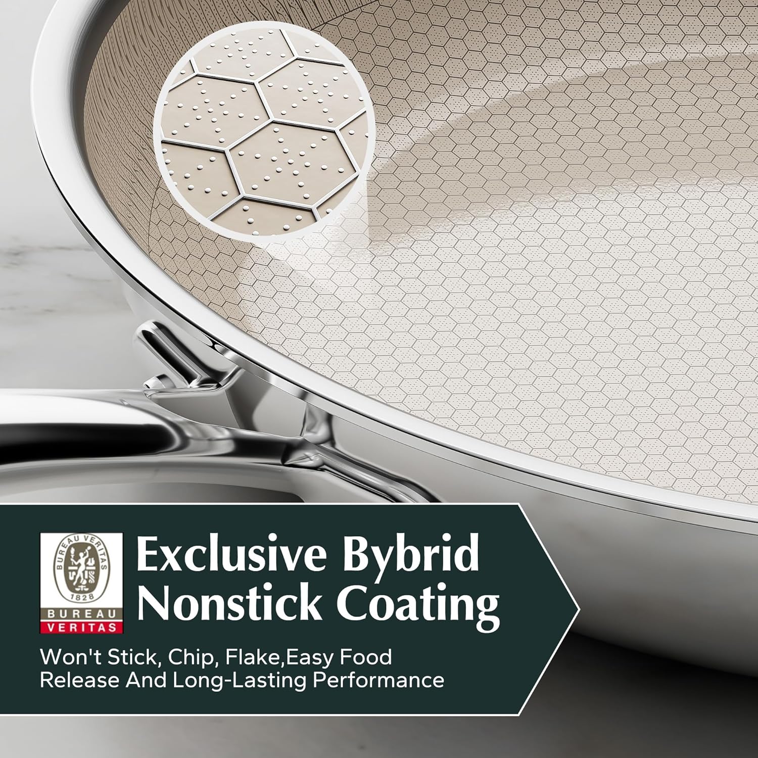 - BV mark Hybrid Nonstick Surface: Laser-etched hexagonal design ensures optimal food release and scratch resistance