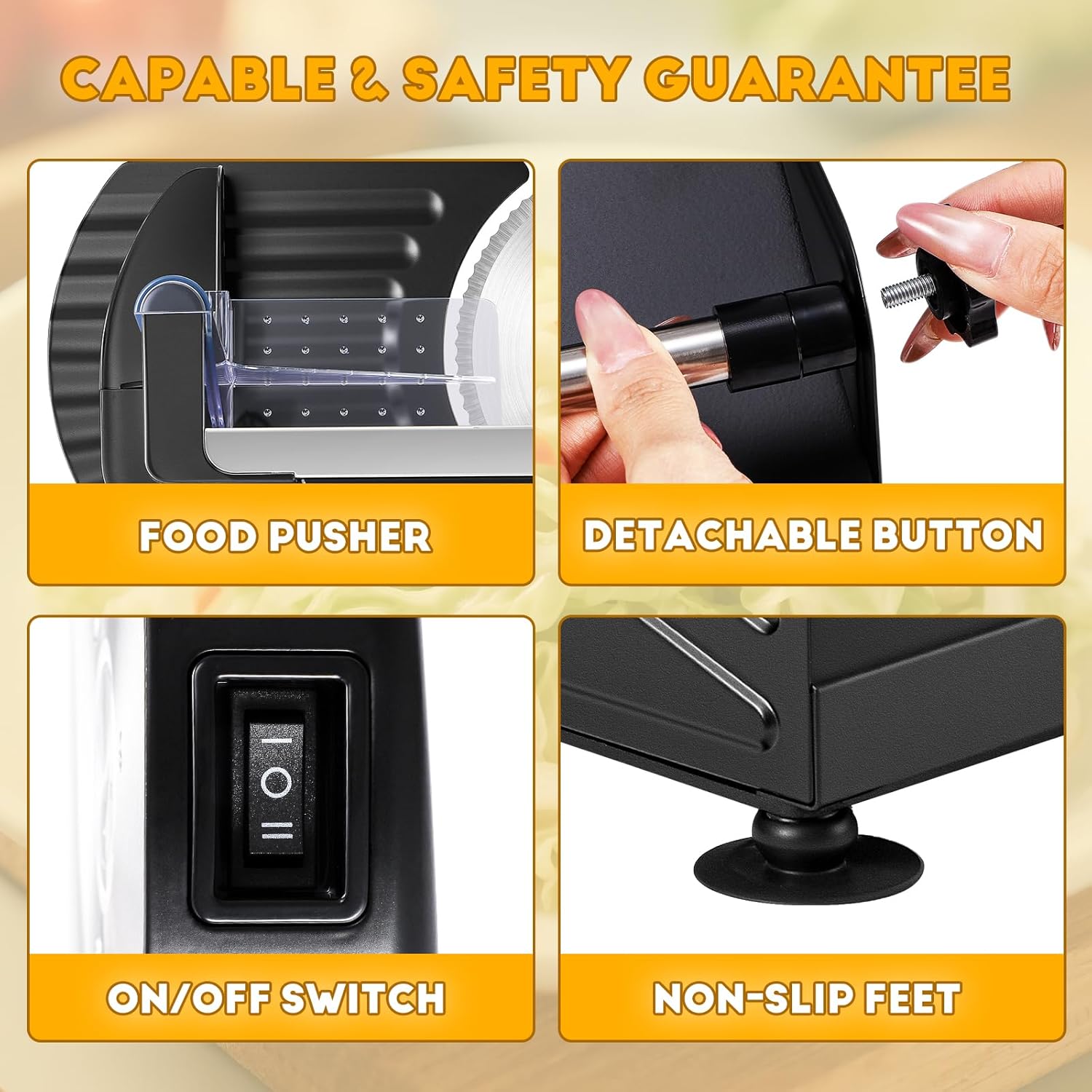 - 4/5'' Adjustable Thickness: The Meat Slicer Machine cuts the food precisely, it makes you like a Pro at home. Adjustable thickness from super thin to approximately 4/5 ‘’ thick for slicing various of food such as meat, deli, cheese, roast beef, turkey breast, vegetables and fruits.
