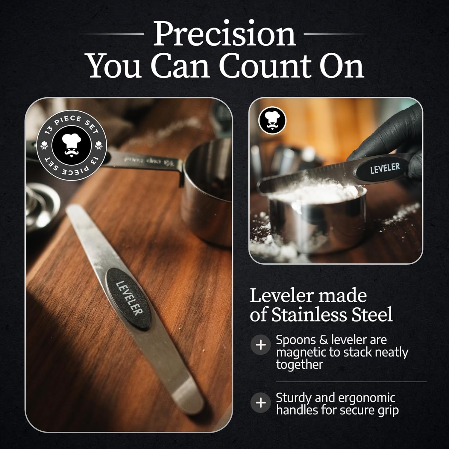 - PRECISION MEETS CONVENIENCE: Bake and cook with confidence! This 13-piece stainless steel measuring set includes dual-sided magnetic spoons, stackable cups, and a leveler for accurate, mess-free measuring every time.