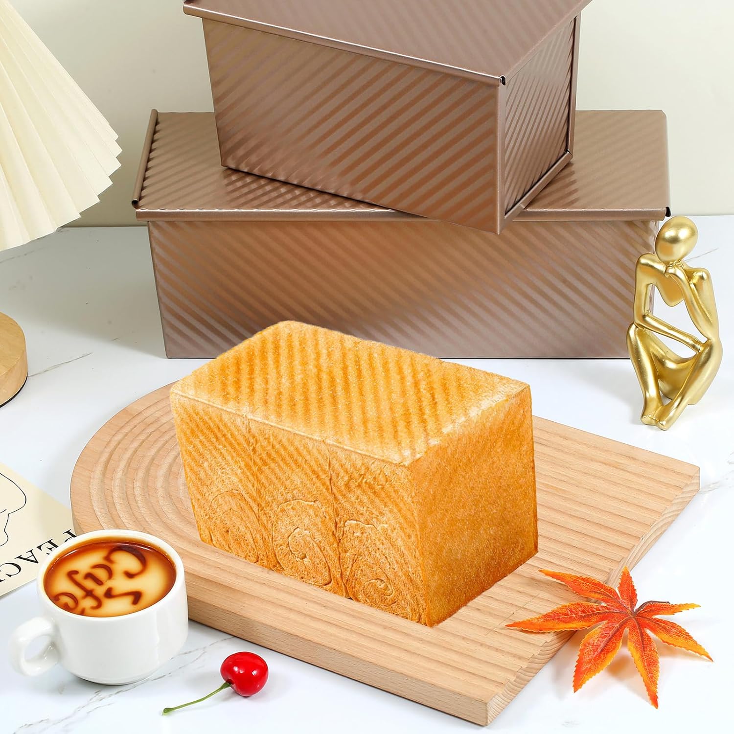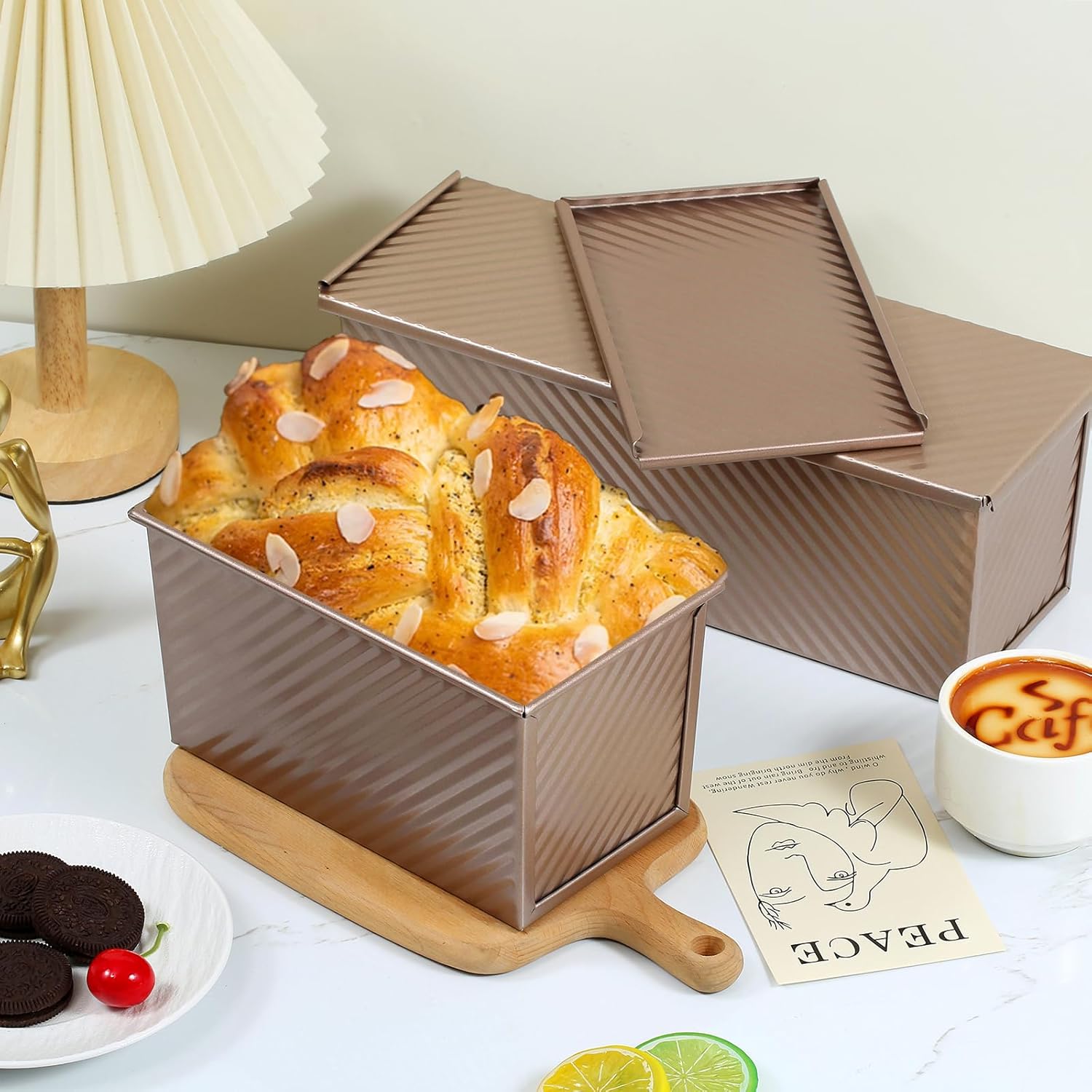 - DOUBLE CAPACITY, ENDLESS OPTIONS: Meet all your baking needs with 2 commercial-grade pullman loaf pans! The 12.5x4.8 inch pan handles 2.2lb dough for family-sized sandwich bread, while the 8.3x4.7 inch pan (1lb capacity) bakes personal sourdough loaves. Durable carbon steel construction withstands 450°F heat for even baking. Includes lids to lock freshness and shape perfect square loaves.