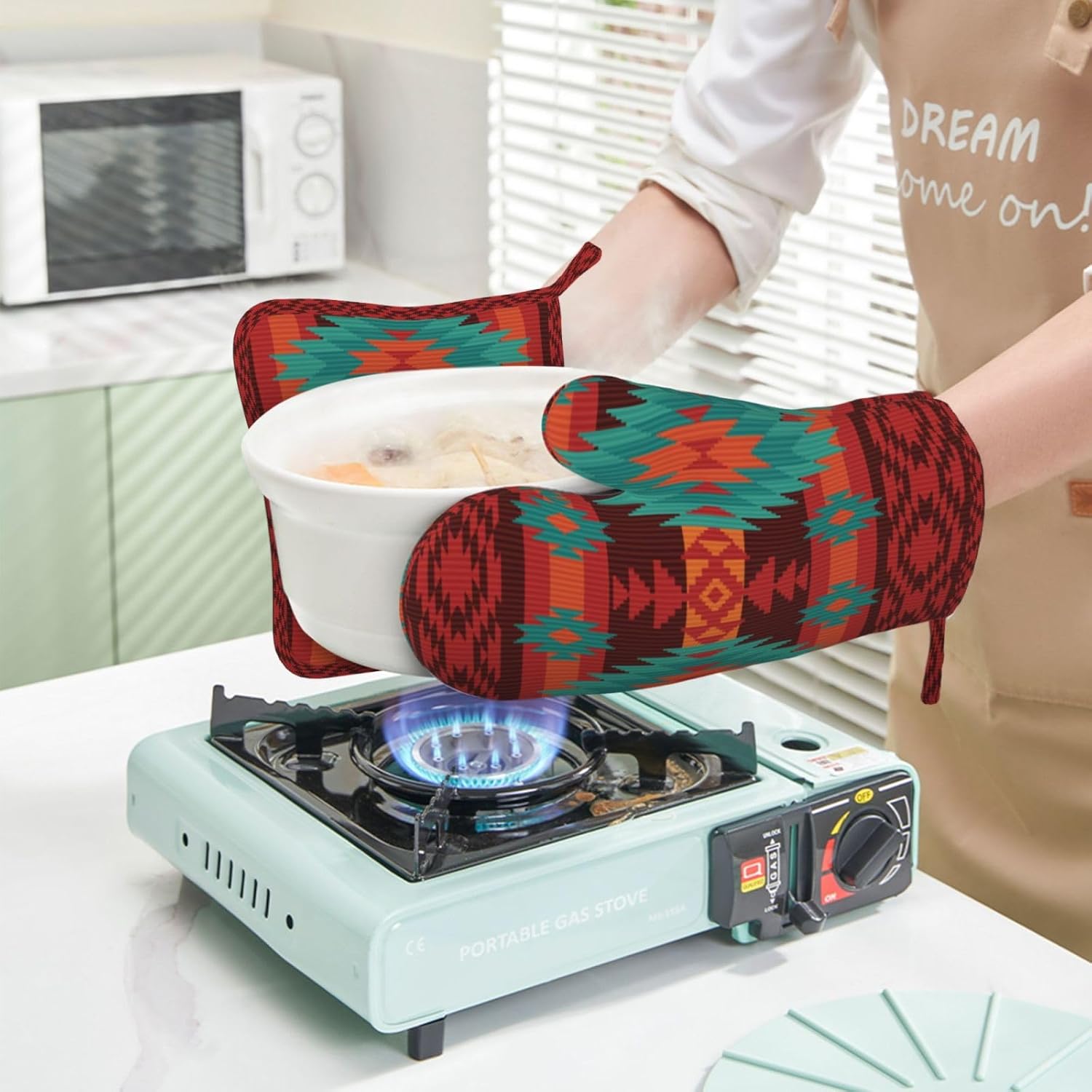 Geometric Ethnic Tribal Oven Mitts and Pot Holders Set of 4 Silicone Native American Kitchen Mitten Gloves and Aztec Western Potholders Set Heat Resistant Oven Gloves Hot Holders for Kitchen