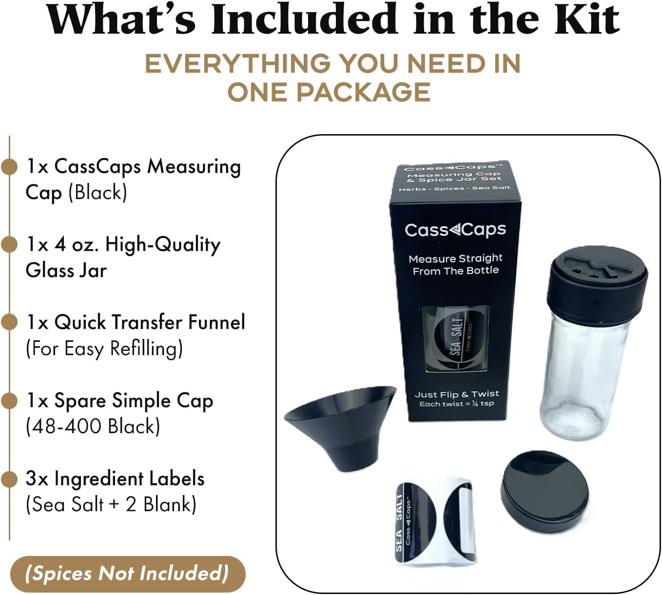 - COMPLETE KIT: Your purchase includes more than just a jar for spices & measuring cap. It’s a complete system which includes a 4oz spice jar with lid, CassCaps measuring cap, quick-transfer funnel, plus (2) blank and (1) preprinted (sea salt) labels. This spice storage container kit provides you with everything you need to store, measure, or just sprinkle to taste your favorite spice without hassle or mess in just seconds