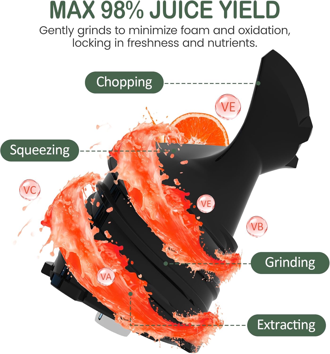 - Cold Press Tech for 98% Juice Yield & Maximum Nutrition: With 55 RPM slow squeezing, this juicer minimizes oxidation and heat, preserving active enzymes and vitamins. Delivers up to 98% juice yield with smooth, pulp-free results.