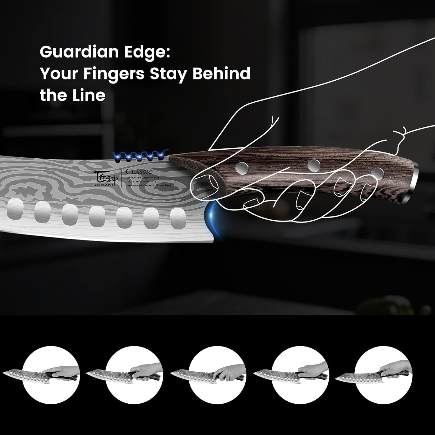 - 1 HANDGUARD, 0 COMPROMISE ON SAFETY—The thoughtful guarded grip design, prevents the hand from sliding towards the blade, as a special structure between the blade and the handle, is the perfect combination of craftsman aesthetics and mechanism safety suits both left/right-handed users, even wet foods such as tomatoes, can be confidently sliced