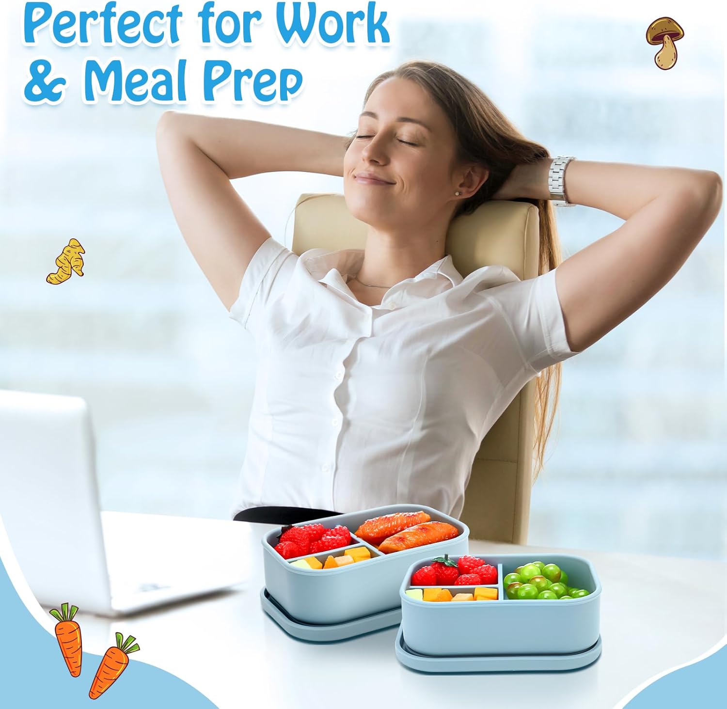 Honeydak 4 Pcs Silicone Bento Lunch Box 3 Compartment Reusable Leakproof Silicone Bento Lunch Container for Adults Microwave Dishwasher Freezer Safe(Blue)