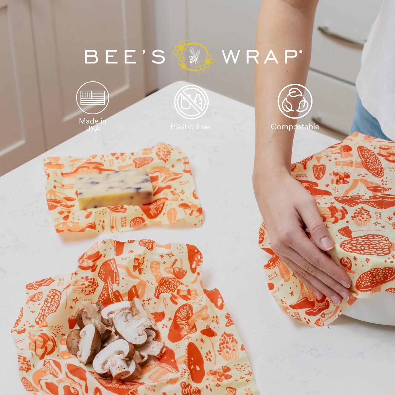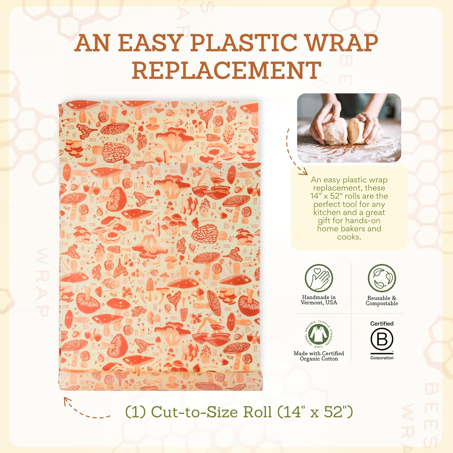 - BEESWAX WRAPS FOR FOOD in a large 14" x 52" wax paper roll featuring a colorful mushroom design. Made in USA reusable beeswax food wraps are a great alternative to single use plastic wrap, sandwich wraps, and aluminum foil.